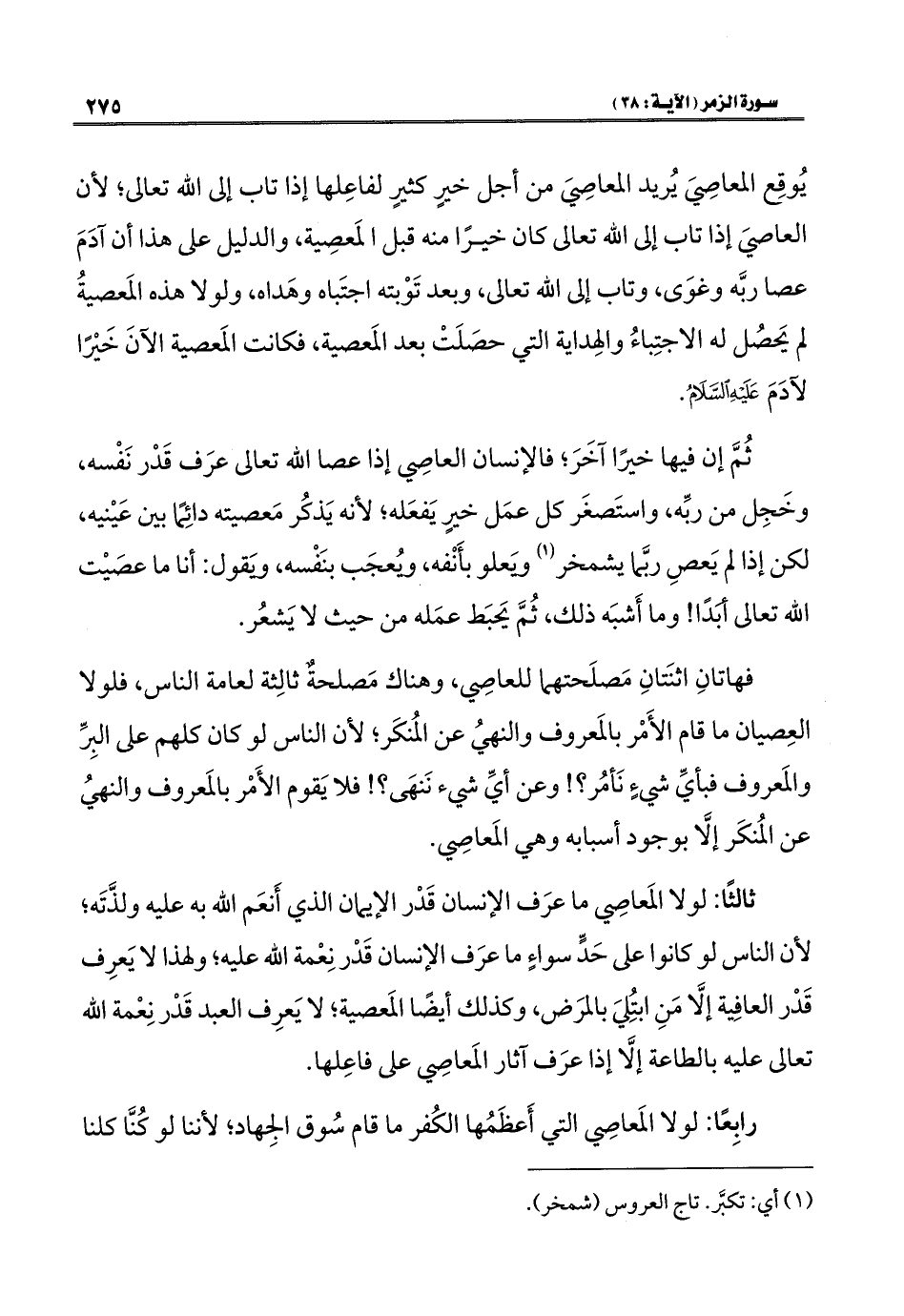 ثُمَّ إن فيها خيرًا آخَرَ؛ فالإنسان العاصِي إذا عصا الله تعالى عرَف قَدْر نَفْسه وخَجِل من ربَّه، واستَصغَر كل عمَل خيرٍ يَفعَله؛ لأنه يَذكُر مَعصيته دائِمًا بين عَيْنيه لكن إذا لم يَعصِ ربَّما يشمخر (١) ويَعلو بأَنْفه، ويُعجَب بنَفْسه، ويَقول: أنا ما عصَيْت الله تعالى أبدًا! وما أَشبَه ذلك، ثُمَّ يَحبَط عمَله من حيث لا يَشعُر.