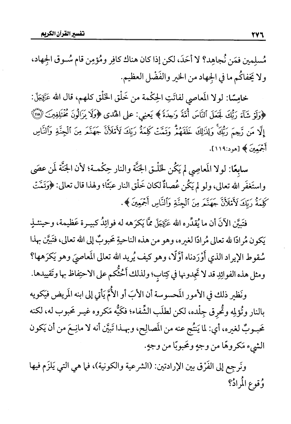 فتَبيَّن الآنَ أن ما يُقدِّره الله عَزَّ وَجَلَّ ممَّا يَكرَهه له فوائِدُ كبيرة عَظيمة، وحينئذٍ يَكون مُرادًا لله تعالى مُرادًا لغيره، وهو من هذه الناحيةِ مَحبوبٌ إلى الله تعالى، فتَبيَّن بهذا سُقوط الإيراد الذي أَوْرَدناه أوَّلًا، وهو كيف يُريد الله تعالى المَعاصيَ وهو يَكرَهها؟ ومثل هذه الفوائِدِ قد لا تَجِدونها في كِتابٍ؛ ولذلك أَحُثُّكم على الاحتِفاظ بها وتَقييدها.