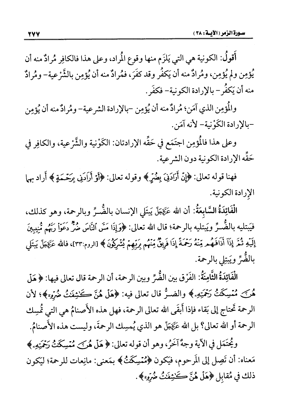 الْفَائِدَةُ الثَّامِنَةُ: الفَرْق بين الضُّرِّ وبين الرحمة، أن الرحمة قال تعالى فيها: {هَلْ هُنَّ مُمْسِكَاتُ رَحْمَتِهِ} والضرُّ قال تعالى فيه: {هَلْ هُنَّ كَاشِفَاتُ ضُرِّهِ}؛ لأن الرحمة تَحتاج إلى بَقاء فإذا أَبقَى الله تعالى الرحمة، فهل هذه الأَصنامُ هي التي تُمسِك الرحمة أو الله تعالى؟ بل الله عَزَّ وَجَلَّ هو الذي يُمسِك الرحمةَ، وليست هذه الأَصنامُ.