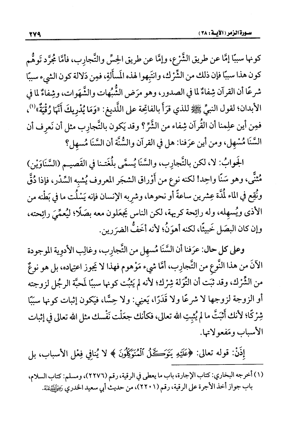 كونها سببًا إمَّا عن طريق الشَّرْع، وإمَّا عن طريق الحِسِّ والتَّجارِب، فأمَّا مُجرَّد تَوهُّم كون هذا سببًا فإن ذلك من الشِّرْك، وانتَبِهوا لهذه المَسأَلةِ، فمِن دَلالة كون الشيء سببًا شرعًا أن القرآن شِفاءٌ لما في الصدور، وهو مرَض الشُّبُهات والشَّهَوات، وشِفاءٌ لما في الأبدان؛ لقول النبيِّ - صلى الله عليه وسلم - للذي قرَأَ بالفاتِحة على اللَّديغ: "وَمَا يُدْرِيكَ أَنَّهَا رُقْيَةٌ" (١)، فمِن أين علِمنا أن القُرآن شِفاء من الشَّرِّ؟ وقد يَكون بالتَّجارِب مثل أن نَعرِف أن السَّنَا مُسْهِل، ومن أين عرَفناة هل في القرآن والسُّنَّة أن السَّنَا مُسهِل؟
