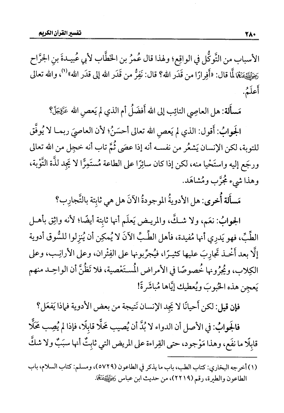 الأسباب من التَّوكُّل في الواقِع؛ ولهذا قال عُمرُ بن الخَطَّاب لأبي عُبيدةَ بنِ الجرَّاح - رضي الله عنهما - لمَّا قال: "أَفِرارًا من قَدَر الله؟ قال: نَفِرُّ من قَدَر الله إلى قدَر الله" (١)، والله تعالى أَعلَمُ.