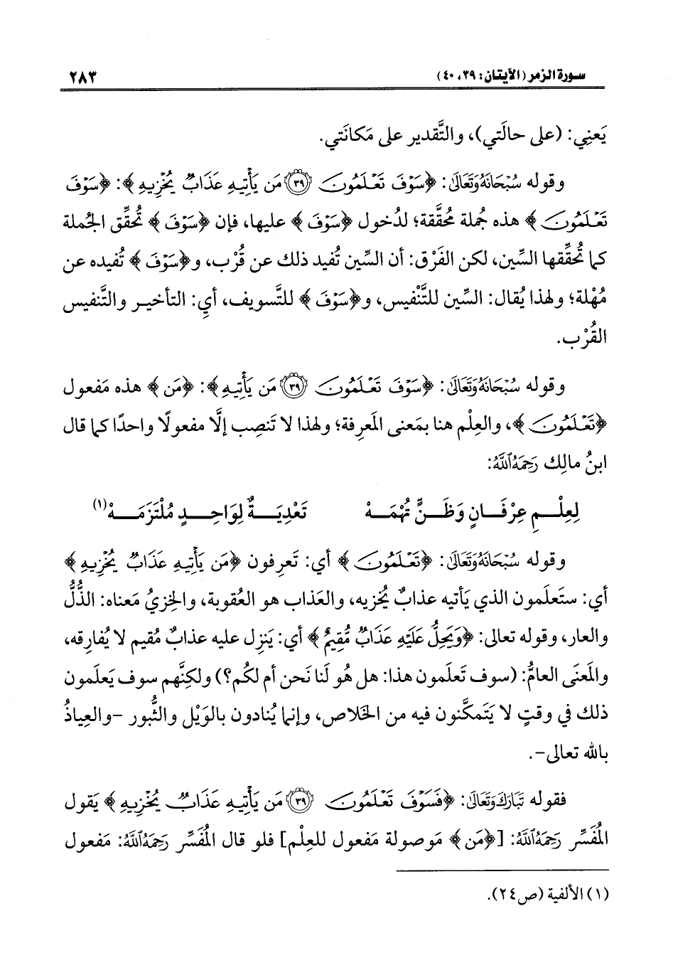 فقوله تَبَارَكَ وَتَعَالَى: {فَسَوْفَ تَعْلَمُونَ (٣٩) مَنْ يَأْتِيهِ عَذَابٌ يُخْزِيهِ} يَقول المُفَسِّر رَحِمَهُ اللهُ: [{مَنْ} مَوصولة مَفعول للعِلْم] فلو قال المُفَسِّر رَحِمَهُ اللهُ: مَفعول