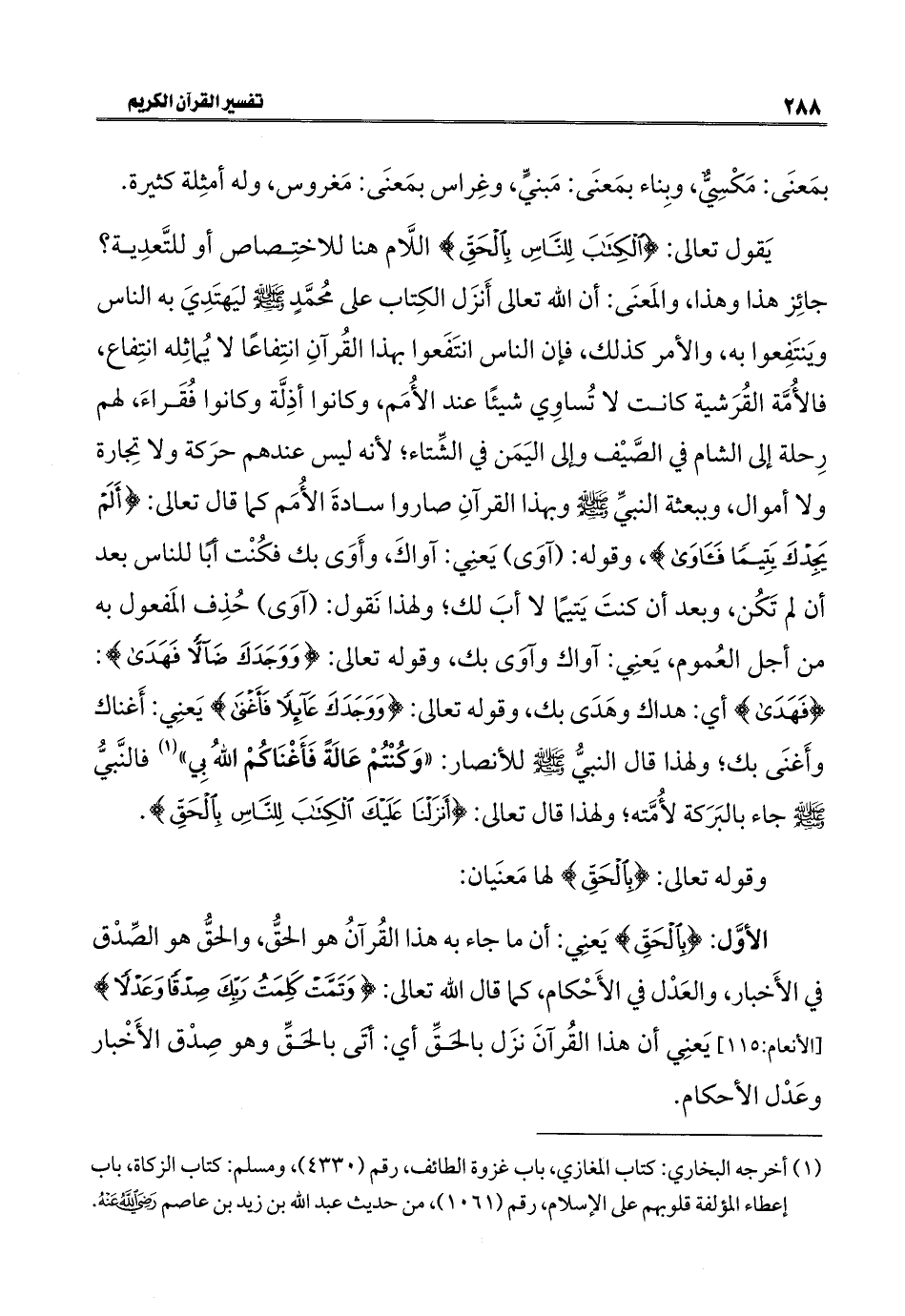 الأوَّل: {بِالْحَقِّ} يَعنِي: أن ما جاء به هذا القُرآنُ هو الحقُّ، والحقُّ هو الصِّدْق في الأَخبار، والعَدْل في الأَحْكام، كما قال الله تعالى: {وَتَمَّتْ كَلِمَتُ رَبِّكَ صِدْقًا وَعَدْلًا} [الأنعام: ١١٥] يَعنِي أن هذا القُرآنَ نزَل بالحَقِّ أي: أتَى بالحَقِّ وهو صِدْق الأَخْبار وعَدْل الأحكام.