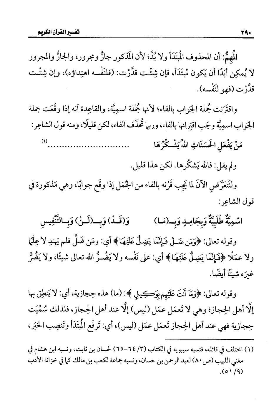ولنَتعَرَّضِ الآنَ لما يَجِب قَرْنه بالفاء من الجُمَل إذا وقَع جوابًا، وهي مَذكورة في قول الشاعِر: