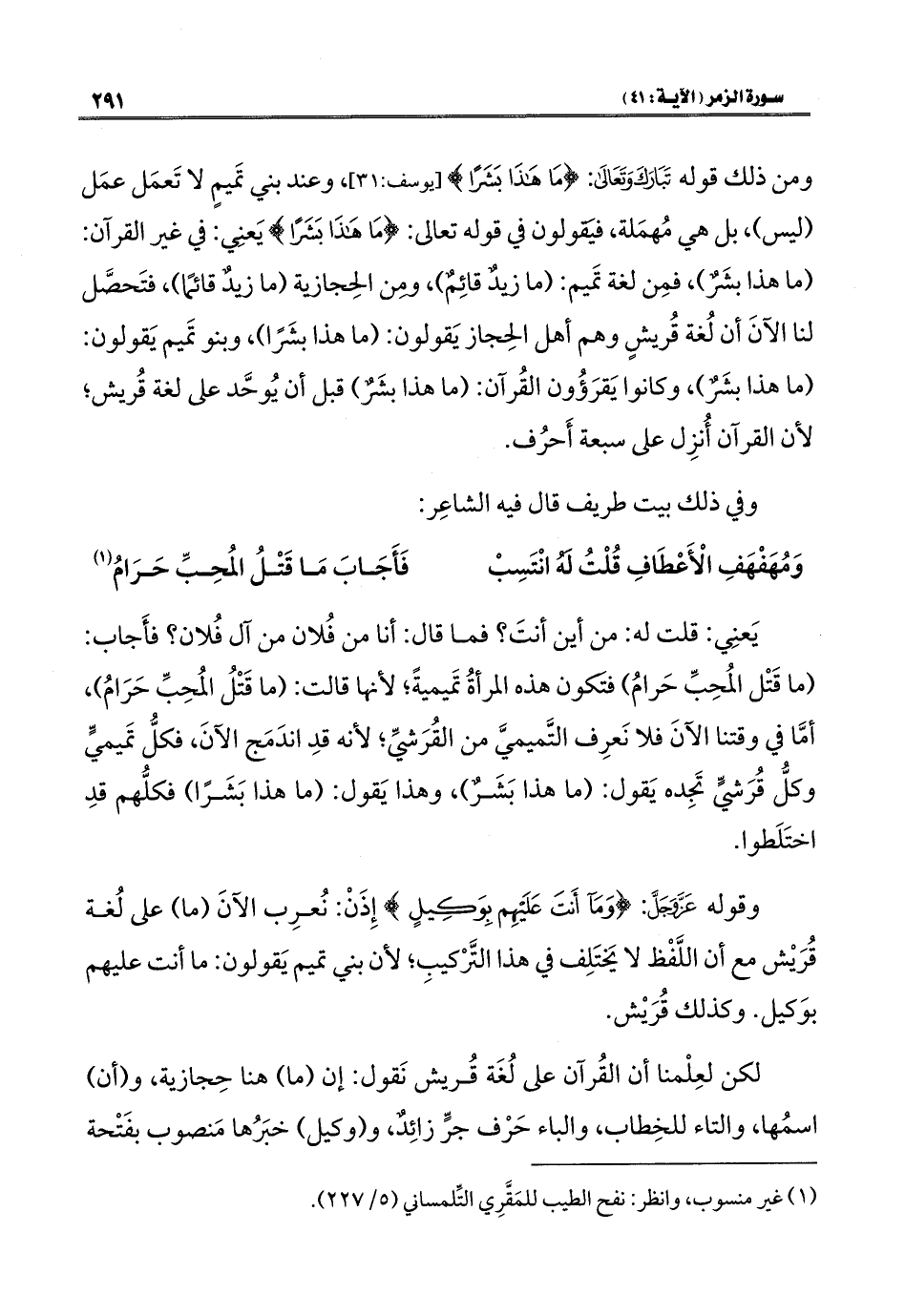 وقوله عَزَّ وَجَلَّ: {وَمَا أَنْتَ عَلَيْهِمْ بِوَكِيلٍ} إِذَنْ: نُعرِب الآنَ (ما) على لُغة قُرَيْش مع أن اللَّفْظ لا يَختَلِف في هذا التَّرْكيبِ؛ لأن بني تميم يَقولون: ما أنت عليهم بوَكيل. وكذلك قُرَيْش.
