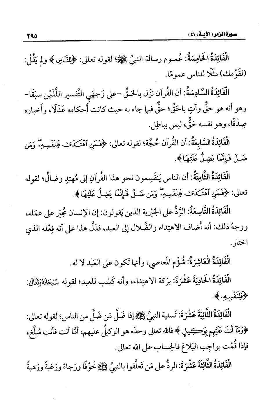 الْفَائِدَةُ التَّاسِعَةُ: الرَّدُّ على الجَبْرية الذين يَقولون: إن الإنسان مُجبَر على عمَله، ووجهُ ذلك: أنه أَضاف الاهتِداء والضَّلال إلى العبد، فدَلَّ هذا على أنه فِعْله الذي اختار.