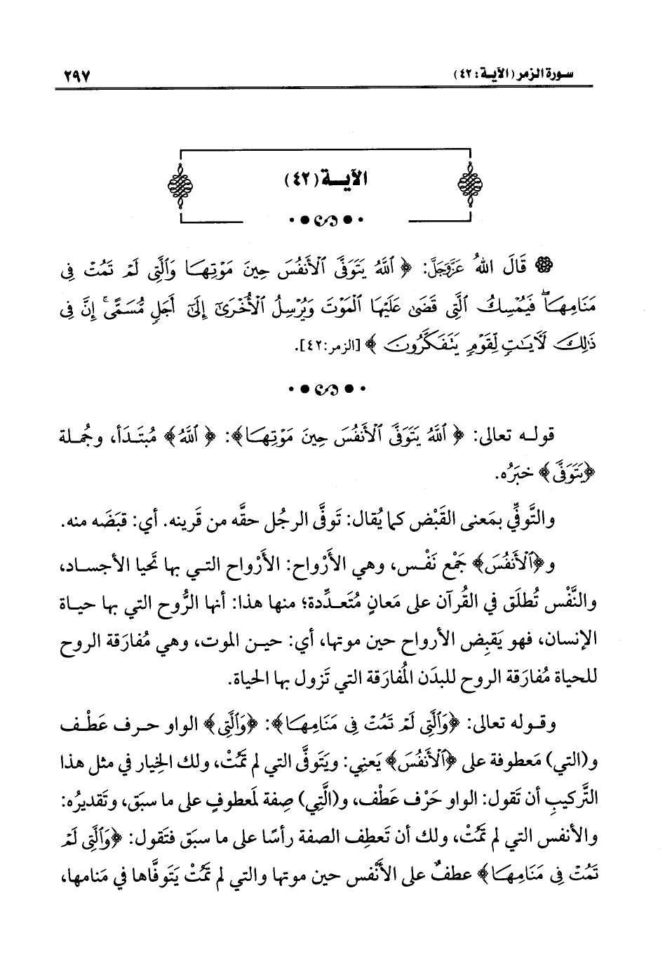 وقوله تعالى: {وَالَّتِي لَمْ تَمُتْ فِي مَنَامِهَا}: {وَالَّتِي} الواو حرف عَطْف و (التي) مَعطوفة على {الْأَنْفُسَ} يَعنِي: ويَتَوفَّى التي لم تَمُتْ، ولك الخِيار في مثل هذا التَّركيبِ أن تَقول: الواو حَرْف عَطْف، و (الَّتِي) صِفة لمَعطوفٍ على ما سبَق، وتَقديرُه: والأنفس التي لم تَمُتْ، ولك أن تَعطِف الصفة رأسًا على ما سبَق فتَقول: {وَالَّتِي لَمْ تَمُتْ فِي مَنَامِهَا} عطفٌ على الأَنْفس حين موتها والتي لم تَمُتْ يَتَوفَّاها في مَنامها،