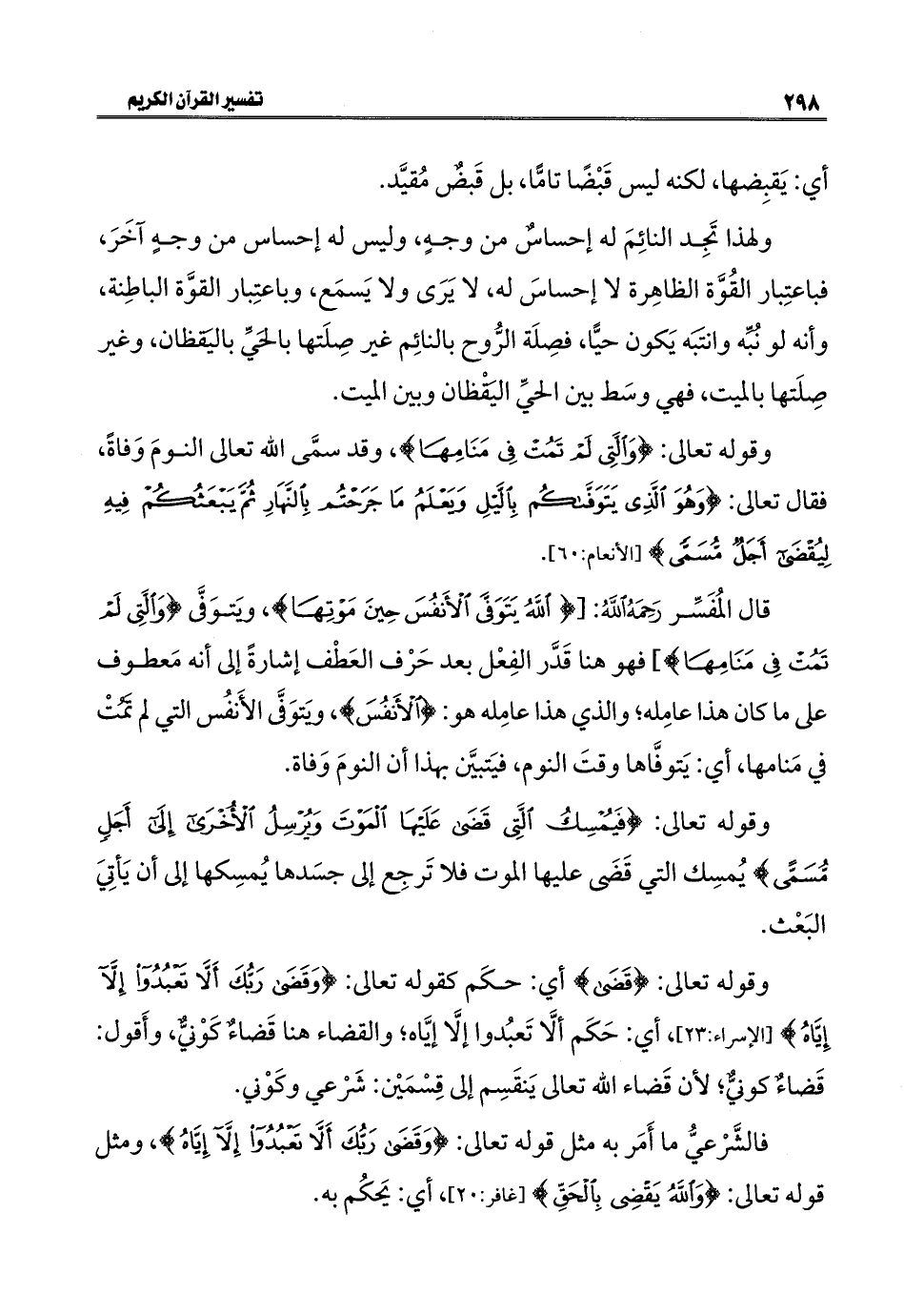وقوله تعالى: {وَالَّتِي لَمْ تَمُتْ فِي مَنَامِهَا}، وقد سمَّى الله تعالى النومَ وَفاةً، فقال تعالى: {وَهُوَ الَّذِي يَتَوَفَّاكُمْ بِاللَّيْلِ وَيَعْلَمُ مَا جَرَحْتُمْ بِالنَّهَارِ ثُمَّ يَبْعَثُكُمْ فِيهِ لِيُقْضَى أَجَلٌ مُسَمًّى} [الأنعام: ٦٠].