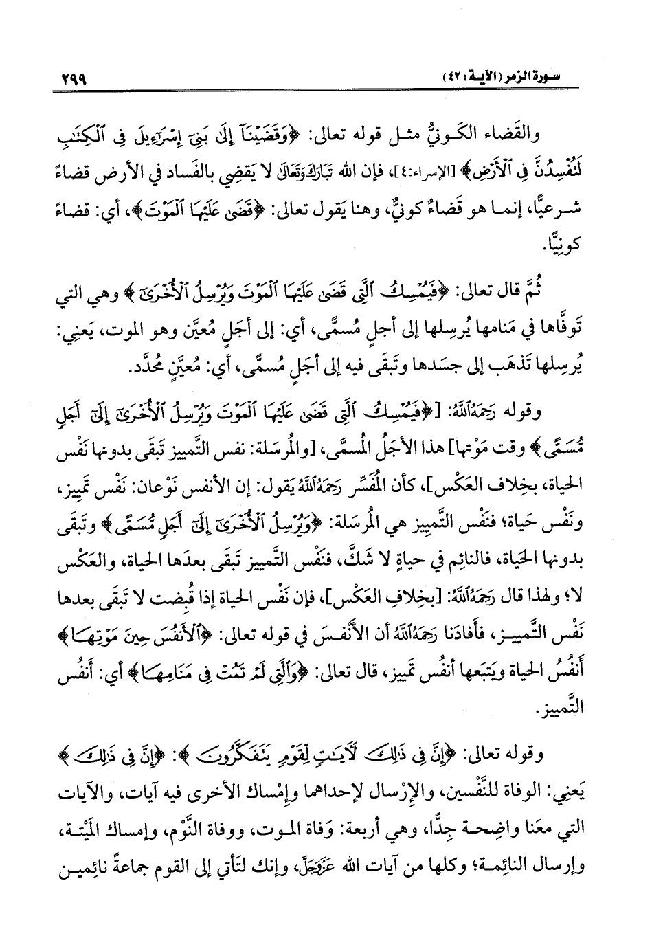 وقوله رَحِمَهُ اللهُ: [{فَيُمْسِكُ الَّتِي قَضَى عَلَيْهَا الْمَوْتَ وَيُرْسِلُ الْأُخْرَى إِلَى أَجَلٍ مُسَمًّى} وقت مَوْتها] هذا الأجَلُ المُسمَّى، [والمُرسَلة: نفس التَّمييز تَبقَى بدونها نَفْس الحياة، بخِلاف العَكْس]، كأن المُفَسِّر رَحِمَهُ اللهُ يَقول: إن الأنفس نَوْعان: نَفْس تَميِيز، ونَفْس حَياة؛ فنَفْس التَّميِيز هي المُرسَلة: {وَيُرْسِلُ الْأُخْرَى إِلَى أَجَلٍ مُسَمًّى} وتَبقَى بدونها الحياة، فالنائِم في حياةٍ لا شَكَّ، فنَفْس التَّمييز تَبقَى بعدَها الحياة، والعَكْس لا؛ ولهذا قال رَحِمَهُ اللهُ: [بخِلافِ العَكْس]، فإن نَفْس الحياة إذا قُبِضت لا تَبقَى بعدها نَفْس التَّمييز، فأَفادَنا رَحِمَهُ اللهُ أن الأَنْفسَ في قوله تعالى: {الْأَنْفُسَ حِينَ مَوْتِهَا} أَنفُسُ الحياة ويَتبَعها أنفُس تَمييز، قال تعالى: {وَالَّتِي لَمْ تَمُتْ فِي مَنَامِهَا} أي: أَنفُس التَّمييز.