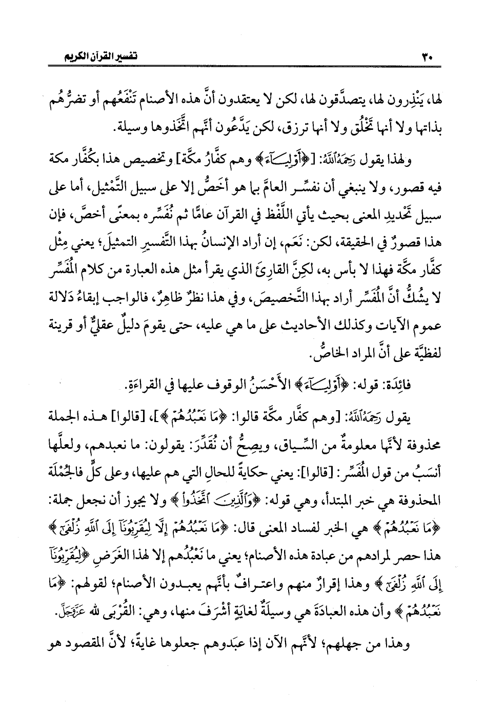 يقول رَحِمَهُ اللهُ: [وهم كفَّار مكَّة قالوا: {مَا نَعْبُدُهُمْ}]، [قالوا] هذه الجملة محذوفة لأنَّها معلومةٌ من السِّياق، ويصِحُّ أن نُقَدِّرَ: يقولون: ما نعبدهم، ولعلَّها أنسَبُ من قول المُفَسِّر: [قالوا]: يعني حكايةً للحالِ التي هم عليها، وعلى كلًّ فالجُمْلَة المحذوفة هي خبر المبتدأ، وهي قوله: {وَالَّذِينَ اتَّخَذُوا} ولا يجوز أن نجعل جملة: {مَا نَعْبُدُهُمْ} هي الخبر لفساد المعنى قال: {مَا نَعْبُدُهُمْ إِلَّا لِيُقَرِّبُونَا إِلَى اللَّهِ زُلْفَى} هذا حصر لمرادهم من عبادة هذه الأصنام؛ يعني ما نَعْبُدُهم إلا لهذا الغَرَضِ {لِيُقَرِّبُونَا إِلَى اللَّهِ زُلْفَى} وهذا إقرارٌ منهم واعترافٌ بأنَّهم يعبدون الأصنام؛ لقولهم: {مَا نَعْبُدُهُمْ} وأن هذه العبادَةَ هي وسيلَةٌ لغايَةٍ أشْرَفَ منها، وهي: القُرْبَى لله عَزَّ وَجَلَّ.