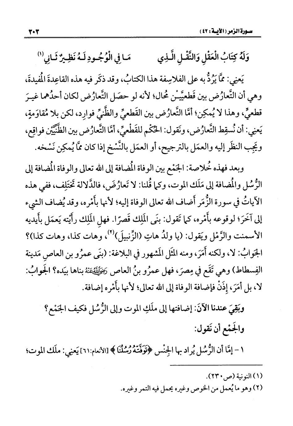 وبعد فهذه خُلاصة: الجَمْع بين الوفاة المُضافة إلى الله تعالى والوفاة المُضافة إلى الرُّسُل والمُضافة إلى مَلَك الموت، وكما قُلنا: لا تَعارُضَ، فالدَّلالة تَختَلِف، ففي هذه الآياتُ في سورة الزُّمَر أَضاف الله تعالى الوفاة إليه؛ لأنها بأَمْره، وقد يُضاف الشيء إلى آخَرَ؛ لوقوعه بأَمْره، كما تَقول: بنَى المَلِك قَصرًا. فهلِ المَلِك رأَيْته يَعمَل بأَيديه الأسمنت والرَّمْل ويَقول: (يا ولدُ هاتِ (الزِّنبيلَ) (٢)، وهات كذا، وهات كذا)؟ الجَوابُ: لا، ولكنه أَمَرَ، ومنه المثَل المَشهور في البلاغة: (بنَى عمرُو بن العاصِ مَدينة الفِسطاط) وهي تَقَع في مِصرَ، فهل عمرُو بنُ العاص - رضي الله عنه - بناها بيَده؟ الجَوابُ: لا، بل أمَرَ، إِذَنْ فإضافة الوفاة إلى الله تعالى؛ لأنها بأَمْره إضافة.