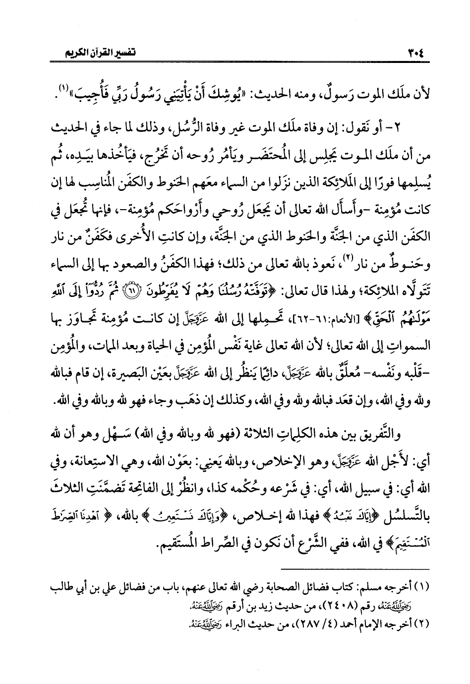 ٢ - أو نَقول: إن وفاة ملَك الموت غير وفاة الرُّسُل، وذلك لما جاء في الحديث من أن ملَك الموت يَجلِس إلى المُحتَضَر ويَأمُر رُوحه أن تَخرُج، فيَأخُذها بيَدِه، ثُم يُسلِمها فورًا إلى المَلائِكة الذين نزَلوا من السماء معَهم الحَنوط والكفَن المُناسِب لها إن كانت مُؤمِنة - وأَسأَل الله تعالى أن يَجعَل رُوحي وأَرْواحَكم مُؤمِنة -، فإنها تُجعَل في الكفَن الذي من الجَنَّة والحَنوط الذي من الجَنَّة، وإن كانتِ الأُخرى فكَفَنٌ من نار وحَنوطٌ من نار (٢)، نَعوذ بالله تعالى من ذلك؛ فهذا الكفَنُ والصعود بها إلى السماء تَتَولَّاه الملائِكة؛ ولهذا قال تعالى: {تَوَفَّتْهُ رُسُلُنَا وَهُمْ لَا يُفَرِّطُونَ (٦١) ثُمَّ رُدُّوا إِلَى اللَّهِ مَوْلَاهُمُ الْحَقِّ} [الأنعام: ٦١، ٦٢]، تَحمِلها إلى الله عَزَّ وَجَلَّ إن كانت مُؤمِنة تَجاوَز بها السمواتِ إلى الله تعالى؛ لأن الله تعالى غاية نَفْس المُؤمِن في الحياة وبعد الممات، والمُؤمِن - قَلْبه ونَفْسه - مُعلَّقٌ بالله عَزَّ وَجَلَّ، دائِمًا يَنظُر إلى الله عَزَّ وَجَلَّ بعَيْن البَصيرة، إن قام فبالله ولله وفي الله، وإن قعَد فبالله ولله وفي الله، وكذلك إن ذهَب وجاء فهو لله وبالله وفي الله.