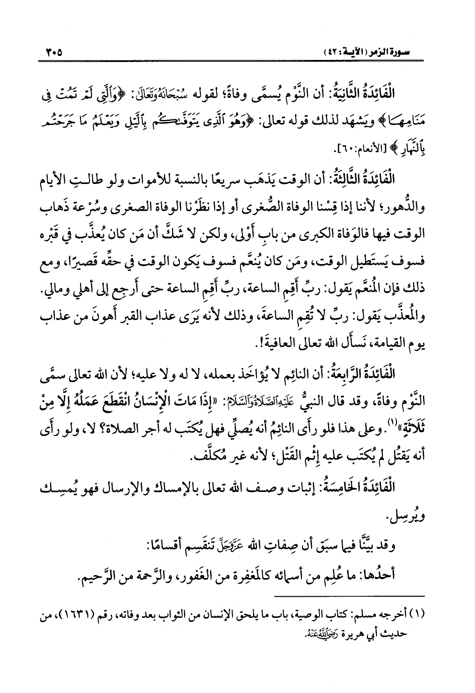 الْفَائِدَةُ الثَّانِيَةُ: أن النَّوْم يُسمَّى وفاةً؛ لقوله سُبْحَانَهُ وَتَعَالَى: {وَالَّتِي لَمْ تَمُتْ فِي مَنَامِهَا} ويَشهَد لذلك قوله تعالى: {وَهُوَ الَّذِي يَتَوَفَّاكُمْ بِاللَّيْلِ وَيَعْلَمُ مَا جَرَحْتُمْ بِالنَّهَارِ} [الأنعام: ٦٠].