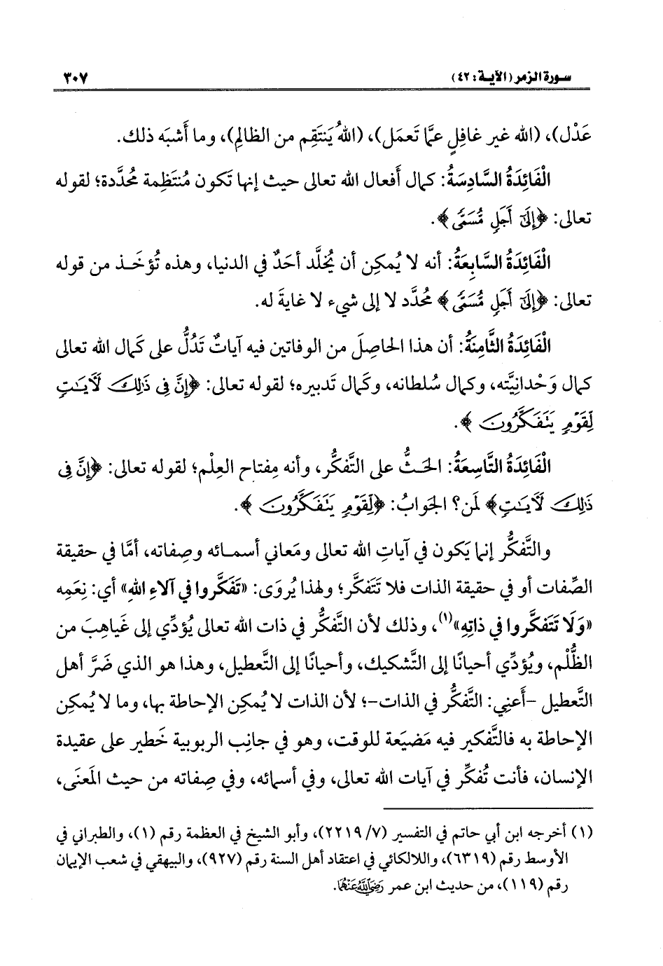 والتَّفكُّر إنما يَكون في آياتِ الله تعالى ومَعاني أسمائه وصِفاته، أمَّا في حقيقة الصِّفات أو في حقيقة الذات فلا تَتَفكَّر؛ ولهذا يُروَى: "تَفَكَّروا في آلاءِ اللهِ" أي: نِعَمِه "وَلَا تَتَفكَّروا في ذاتِهِ" (١)، وذلك لأن التَّفكُّر في ذات الله تعالى يُؤدِّي إلى غَياهِبَ من الظُّلْم، ويُؤدِّي أحيانًا إلى التَّشكيك، وأحيانًا إلى التَّعطيل، وهذا هو الذي ضَرَّ أهل التَّعطيل - أَعنِي: التَّفكُّر في الذات -؛ لأن الذات لا يُمكِن الإحاطة بها، وما لا يُمكِن الإحاطة به فالتَّفكير فيه مَضيَعة للوقت، وهو في جانِب الربوبية خَطير على عقيدة الإنسان، فأنت تُفكِّر في آيات الله تعالى، وفي أسمائه، وفي صِفاته من حيث المَعنَى،