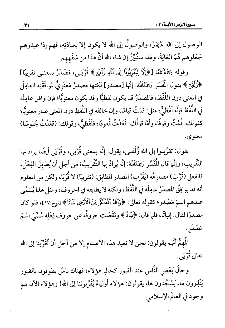 وقوله رَحِمَهُ اللهُ: [{إِلَّا لِيُقَرِّبُونَا إِلَى اللَّهِ زُلْفَى} قُرْبَى، مَصْدَرٌ بمعنى تقريبًا] {زُلْفَى} يقول المُفَسِّر رَحِمَهُ اللهُ: إنَّها [مصدر] لكنها مصدرٌ مَعْنَوِيٌّ لموافَقَتِه العامِلَ في المعنى دون اللَّفْظ، فالمصدَرُ قد يكون لفظيًّا وقد يكون معنويًّا؛ فإن وافق عامِلَه في اللَّفْظ فإنَّه لَفْظيٌّ؛ مثل: قمْتُ قيامًا، وإن خالفه في اللَّفْظِ دون المعنى صار معنويًّا؛ كقولك: قُمْتُ وقوفًا، وأمَّا قولُك: قَعَدْتُ قُعودًا؛ فلَفْظيٌّ، وقولك: (قعَدْتُ جُلوسًا) معنوي.