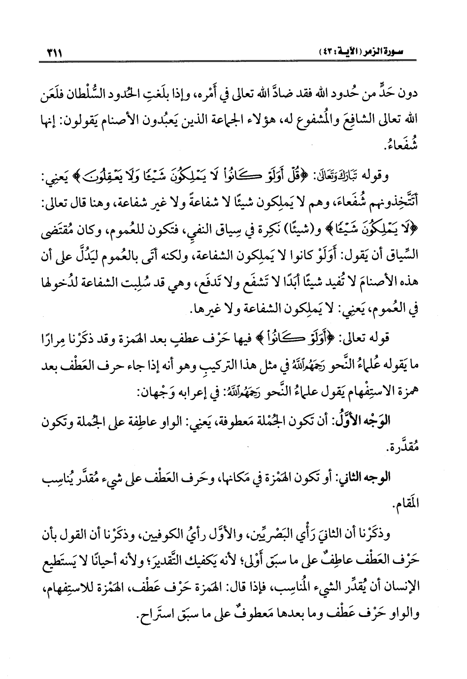 وقوله تَبَارَكَ وَتَعَالَى: {قُلْ أَوَلَوْ كَانُوا لَا يَمْلِكُونَ شَيْئًا وَلَا يَعْقِلُونَ} يَعنِي: أتَتَّخِذونهم شُفَعاءَ، وهم لا يَملِكون شيئًا لا شفاعةً ولا غير شفاعة، وهنا قال تعالى: {لَا يَمْلِكُونَ شَيْئًا} و (شيئًا) نَكِرة في سِياق النفيِ، فتكون للعُموم، وكان مُقتَضى السِّياق أن يَقول: أَوَلَوْ كانوا لا يَملِكون الشفاعة، ولكنه أتَى بالعُموم ليَدُلَّ على أن هذه الأصنامَ لا تُفيد شيئًا أبَدًا لا تَشفَع ولا تَدفَع، وهي قد سُلِبت الشفاعة لدُخولها في العُموم، يَعنِي: لا يَملِكون الشفاعة ولا غيرها.