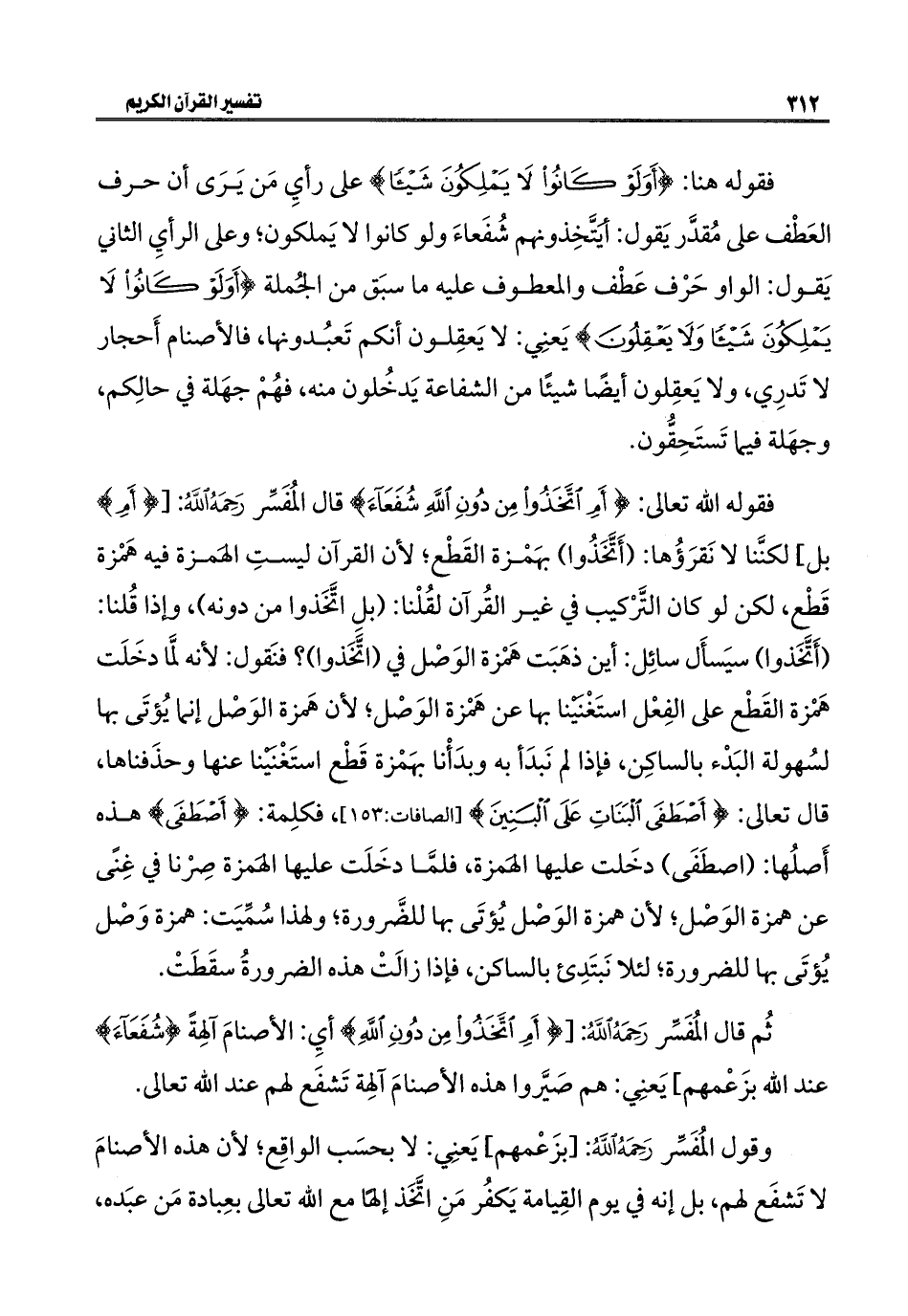فقوله الله تعالى: {أَمِ اتَّخَذُوا مِنْ دُونِ اللَّهِ شُفَعَاءَ} قال المُفَسِّر رَحِمَهُ اللهُ: [{أَمِ} بل] لكنَّنا لا نَقرَؤُها: (أَتَّخَذُوا) بهَمْزة القَطْع؛ لأن القرآن ليستِ الهَمزة فيه هَمْزة قَطْع، لكن لو كان التَّرْكيب في غير القُرآن لقُلْنا: (بلِ اتَّخَذوا من دونه)، وإذا قُلنا: (أَتَّخَذوا) سيَسأَل سائِل: أين ذهَبَت هَمْزة الوَصْل في (اتَّخَذوا)؟ فنَقول: لأنه لمَّا دخَلَت هَمْزة القَطْع على الفِعْل استَغْنَيْنا بها عن هَمْزة الوَصْل؛ لأن هَمزة الوَصْل إنما يُؤتَى بها لسُهولة البَدْء بالساكِن، فإذا لم نَبدَأ به وبدَأْنا بهَمْزة قَطْع استَغْنَيْنا عنها وحذَفناها، قال تعالى: {أَصْطَفَى الْبَنَاتِ عَلَى الْبَنِينَ} [الصافات: ١٥٣]، فكلِمة: {أَصْطَفَى} هذه أَصلُها: (اصطَفَى) دخَلت عليها الهَمزة، فلمَّا دخَلَت عليها الهَمزة صِرْنا في غِنًى عن همزة الوَصْل؛ لأن همزة الوَصْل يُؤتَى بها للضَّرورة؛ ولهذا سُمِّيَت: همزة وَصْل يُؤتَى بها للضرورة؛ لئلا نَبتَدِئ بالساكن، فإذا زالَتْ هذه الضرورةُ سقَطَتْ.