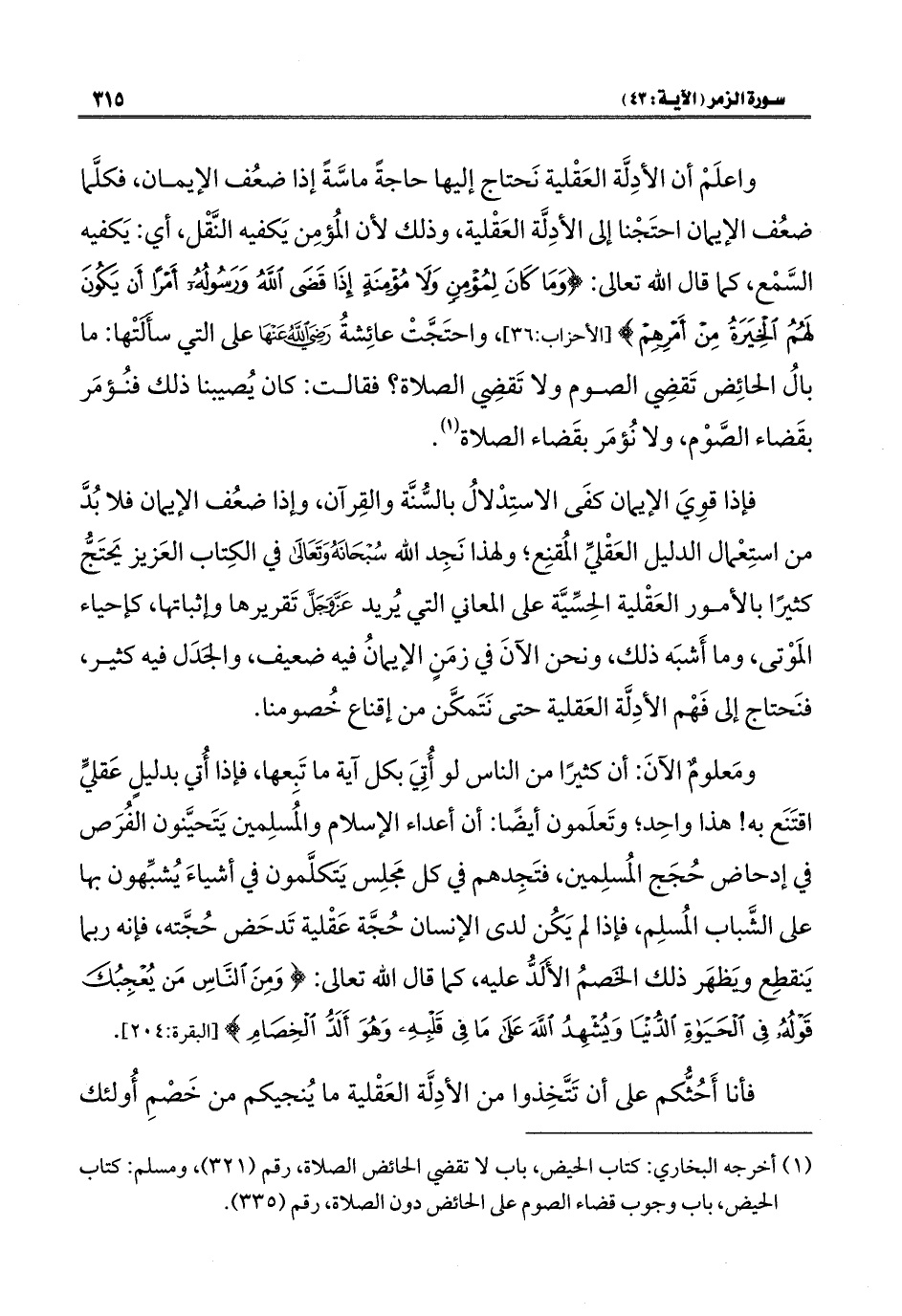 واعلَمْ أن الأدِلَّة العَقْلية نَحتاج إليها حاجةً ماسَّةً إذا ضعُف الإيمان، فكلَّما ضعُف الإيمان احتَجْنا إلى الأدِلَّة العَقْلية، وذلك لأن المُؤمِن يَكفيه النَّقْل، أي: يَكفيه السَّمْع، كما قال الله تعالى: {وَمَا كَانَ لِمُؤْمِنٍ وَلَا مُؤْمِنَةٍ إِذَا قَضَى اللَّهُ وَرَسُولُهُ أَمْرًا أَنْ يَكُونَ لَهُمُ الْخِيَرَةُ مِنْ أَمْرِهِمْ} [الأحزاب: ٣٦]، واحتَجَّتْ عائِشةُ - رضي الله عنها - على التي سأَلَتْها: ما بالُ الحائِض تَقضِي الصوم ولا تَقضِي الصلاة؟ فقالت: كان يُصيبنا ذلك فنُؤمَر بقَضاء الصَّوْم، ولا نُؤمَر بقَضاء الصلاة (١).