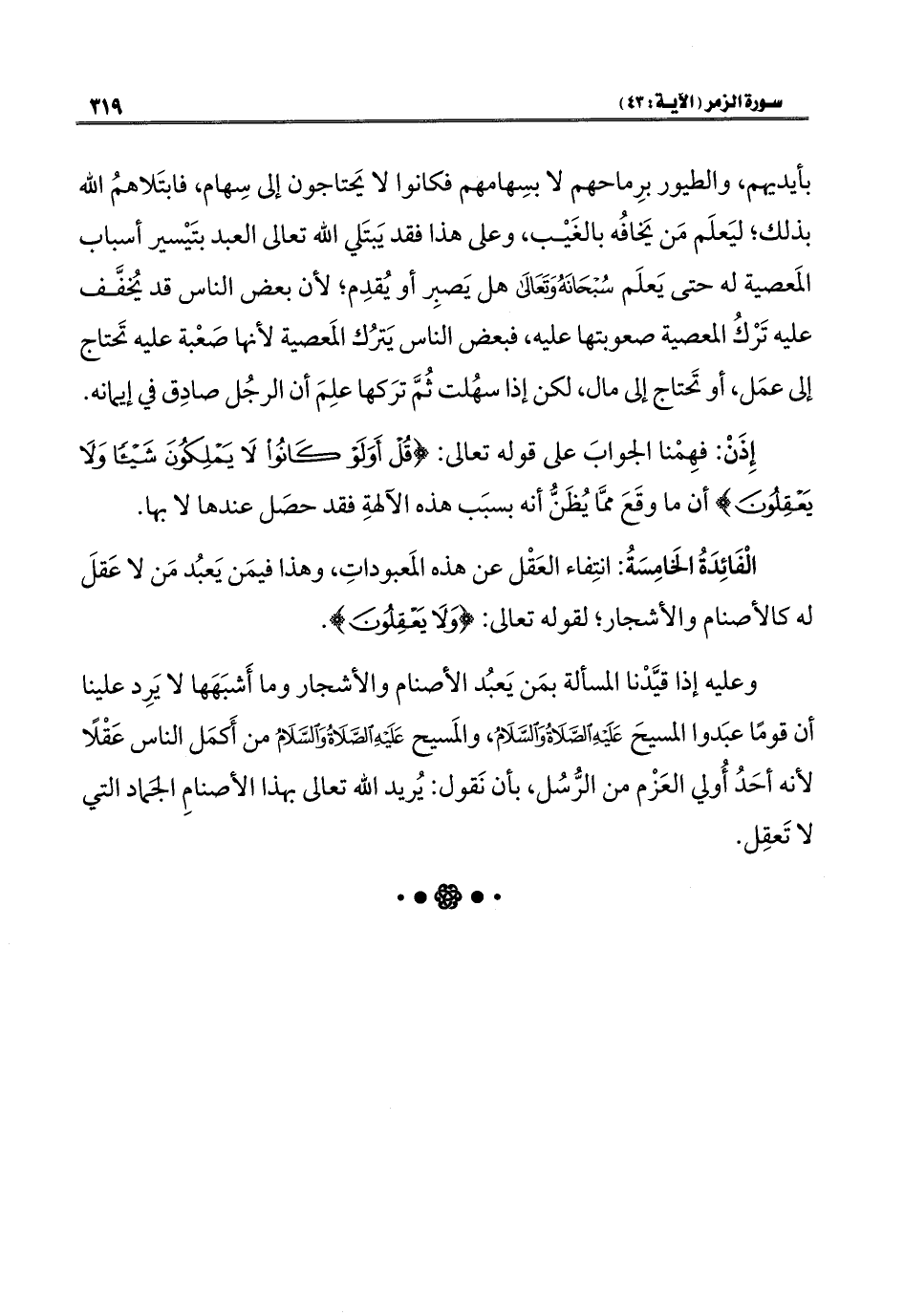 وعليه إذا قيَّدْنا المسألة بمَن يَعبُد الأصنام والأشجار وما أَشبَهَها لا يَرِد علينا أن قومًا عبَدوا المسيحَ عَلَيْهِ الصَّلاةُ وَالسَّلَامُ، والمَسيح عَلَيْهِ الصَّلاةُ وَالسَّلَامُ من أَكمَل الناس عَقْلًا لأنه أحَدُ أُولي العَزْم من الرُّسُل، بأن نَقول: يُريد الله تعالى بهذا الأصنامِ الجَماد التي لا تَعقِل.