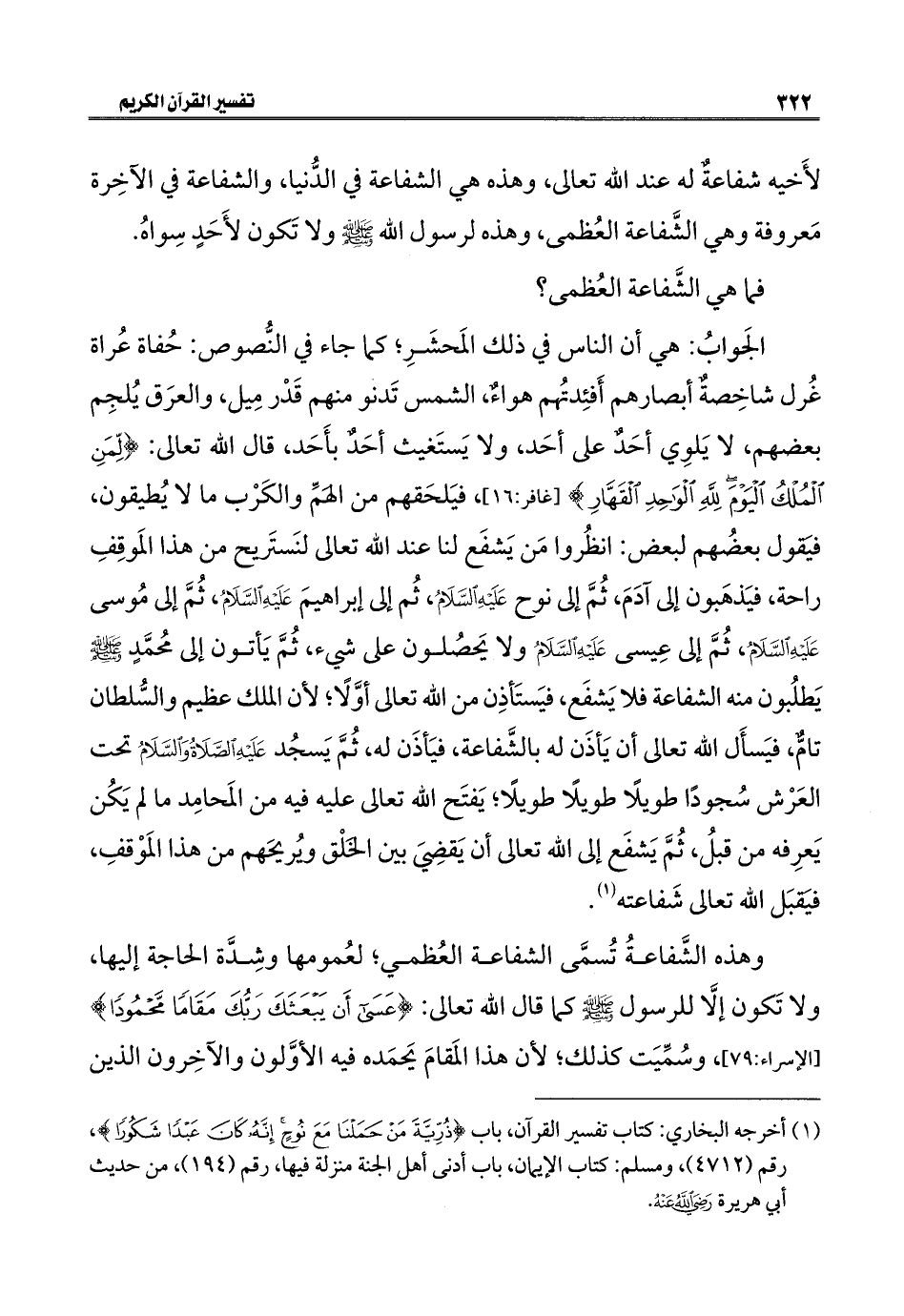 الجَوابُ: هي أن الناس في ذلك المَحشَرِ؛ كما جاء في النُّصوص: حُفاة عُراة غُرل شاخِصةٌ أبصارهم أَفئِدتُهم هواءٌ، الشمس تَدنو منهم قَدْر مِيل، والعرَق يُلجِم بعضهم، لا يَلوِي أحَدٌ على أحَد، ولا يَستَغيث أحَدٌ بأَحَد، قال الله تعالى: {لِمَنِ الْمُلْكُ الْيَوْمَ لِلَّهِ الْوَاحِدِ الْقَهَّارِ} [غافر: ١٦]، فيَلحَقهم من الهَمِّ والكَرْب ما لا يُطيقون، فيَقول بعضُهم لبعض: انظُروا مَن يَشفَع لنا عند الله تعالى لنَستَريح من هذا المَوقِفِ راحة، فيَذهَبون إلى آدَمَ، ثُمَّ إلى نوح عَلَيْهِ السَّلَامُ، ثُم إلى إبراهيمَ عَلَيْهِ السَّلَامُ، ثُمَّ إلى مُوسى عَلَيْهِ السَّلَامُ، ثُمَّ إلى عِيسى عَلَيْهِ السَّلَامُ ولا يَحصُلون على شيء، ثُمَّ يَأتون إلى مُحمَّدٍ - صلى الله عليه وسلم - يَطلُبون منه الشفاعة فلا يَشفَع، فيَستَأذِن من الله تعالى أوَّلًا؛ لأن الملك عظيم والسُّلطان تامٌّ، فيَسأَل الله تعالى أن يَأذَن له بالشَّفاعة، فيَأذَن له، ثُمَّ يَسجُد عَلَيْهِ الصَّلاةُ وَالسَّلَامُ تحت العَرْش سُجودًا طويلًا طويلًا طويلًا؛ يَفتَح الله تعالى عليه فيه من المَحامِد ما لم يَكُن يَعرِفه من قبلُ، ثُمَّ يَشفَع إلى الله تعالى أن يَقضِيَ بين الخَلْق ويُريحَهم من هذا المَوْقفِ، فيَقبَل الله تعالى شَفاعته (١).