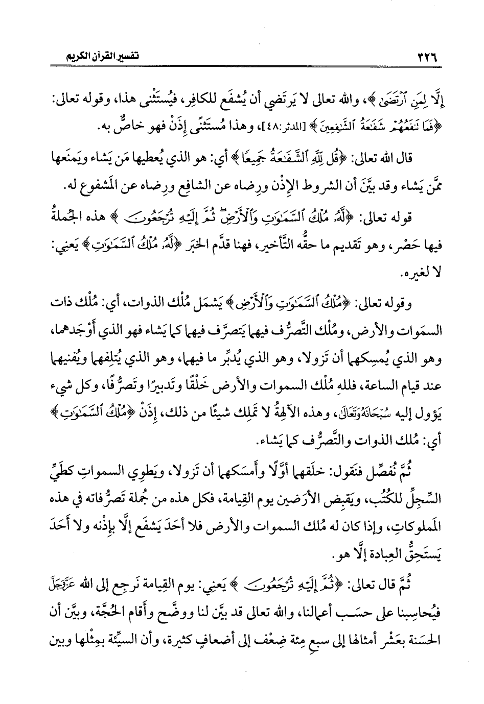 ثُمَّ نُفصِّل فنَقول: خلَقهما أوَّلَّا وَأَمسَكهما أن تَزولا، ويَطوِي السمواتِ كطَيِّ السِّجِلِّ للكُتُب، ويَقبِض الأرَضين يوم القِيامة، فكل هذه من جُملة تَصرُّفاته في هذه المَملوكاتِ، وإذا كان له مُلك السموات والأرض فلا أحَدَ يَشفَع إلَّا بإِذْنه ولا أَحَدَ يَستَحِقُّ العِبادة إلَّا هو.