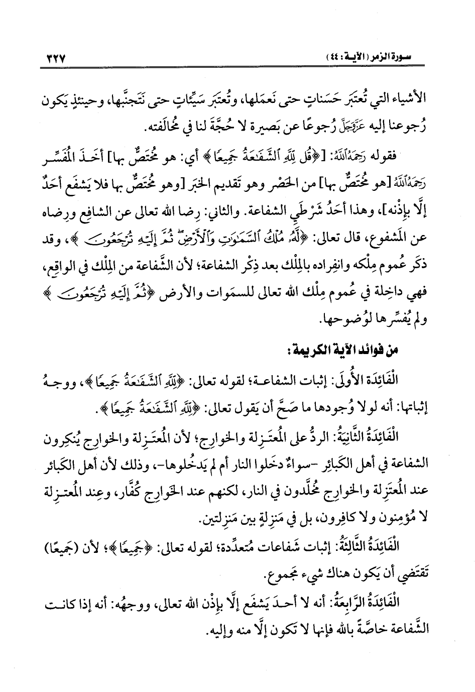الْفَائِدَة الأُولَى: إثبات الشفاعة؛ لقوله تعالى: {لِلَّهِ الشَّفَاعَةُ جَمِيعًا}، ووجهُ إثباتها: أنه لولا وُجودها ما صَحَّ أن يَقول تعالى: {لِلَّهِ الشَّفَاعَةُ جَمِيعًا}.