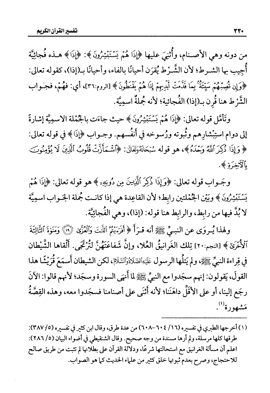 ولهذا يُروَى عن النبيِّ - صلى الله عليه وسلم - أنه قرَأَ {أَفَرَأَيْتُمُ اللَّاتَ وَالْعُزَّى (١٩) وَمَنَاةَ الثَّالِثَةَ الْأُخْرَى} [النجم: ١٩، ٢٠] تِلك الغَرانيقُ العُلا، وإنَّ شَفاعَتَهُنَّ لتُرْتَجَى. ألقاها الشَّيْطان في قِراءة النبيِّ - صلى الله عليه وسلم -، ولم يَتلُها الرسول عَلَيْهِ الصَّلاةُ وَالسَّلَامُ، لكن الشيطان أَسمَعَ قُرَيْشًا هذا القولَ، يَقولون: إنهم سجَدوا مع النبيِّ - صلى الله عليه وسلم - لما أَنهَى السورة وسجَد؛ لأنهم قالوا: الآنَ رجَع إلينا، أو على الأقَلِّ داهَنَنا؛ لأنه أَثنَى على أصنامنا فسجَدوا معه، وهذه القِصَّةُ مَشهورة (١).