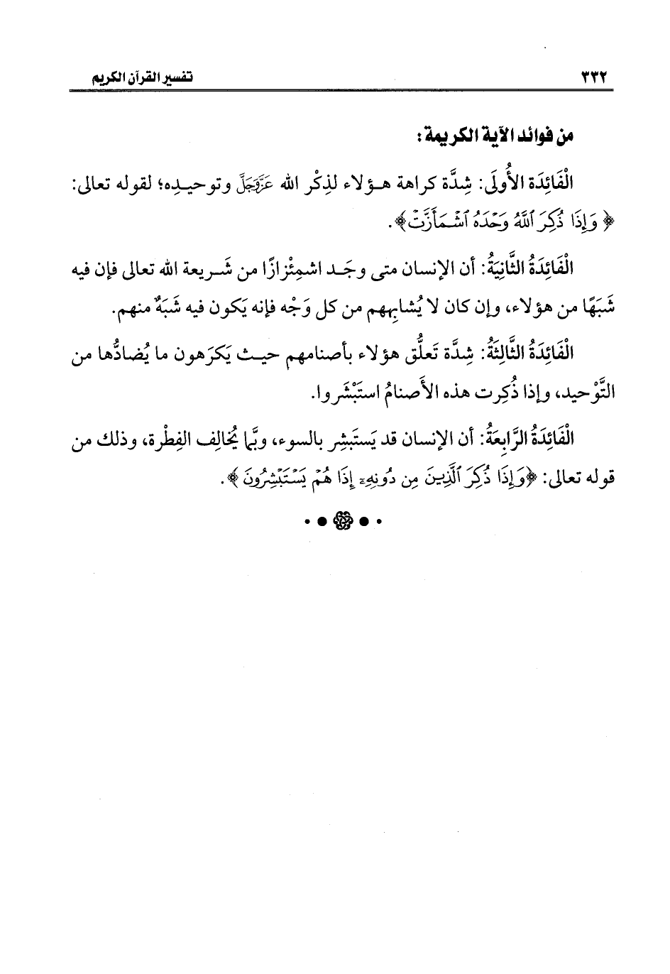 الْفَائِدَةُ الرَّابِعَةُ: أن الإنسان قد يَستَبشِر بالسوء، وبما يُخالِف الفِطْرة، وذلك من قوله تعالى: {وَإِذَا ذُكِرَ الَّذِينَ مِنْ دُونِهِ إِذَا هُمْ يَسْتَبْشِرُونَ}.