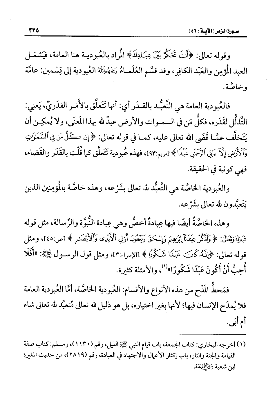 فمَحطُّ المَدْح من هذه الأنواع والأقسام: العُبودية الخاصَّة، أمَّا العُبودية العامة فلا يُمدَح الإنسان فيها؛ لأنها بغير اختياره، بل هو ذليل لله تعالى مُتعبِّد لله تعالى شاء أم أبَى.