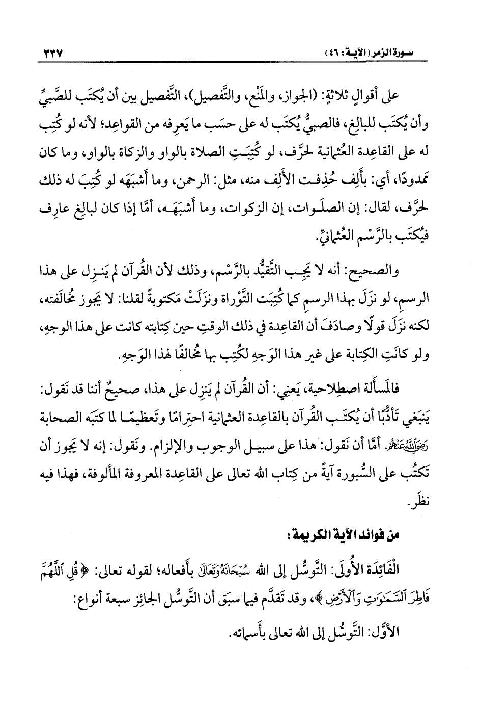 فالمَسأَلة اصطِلاحية، يَعنِي: أن القُرآن لم يَنزِل على هذا، صحيحٌ أننا قد نَقول: يَنبَغي تَأدُّبًا أن يُكتَب القُرآن بالقاعِدة العثمانية احتِرامًا وتَعظيمًا لما كتبَه الصحابة - رضي الله عنهم -. أمَّا أن نَقول: هذا على سبيل الوجوب والإلزام. ونَقول: إنه لا يَجوز أن تَكتُب على السُّبورة آيةً من كِتاب الله تعالى على القاعِدة المعروفة المألوفة، فهذا فيه نظَر.