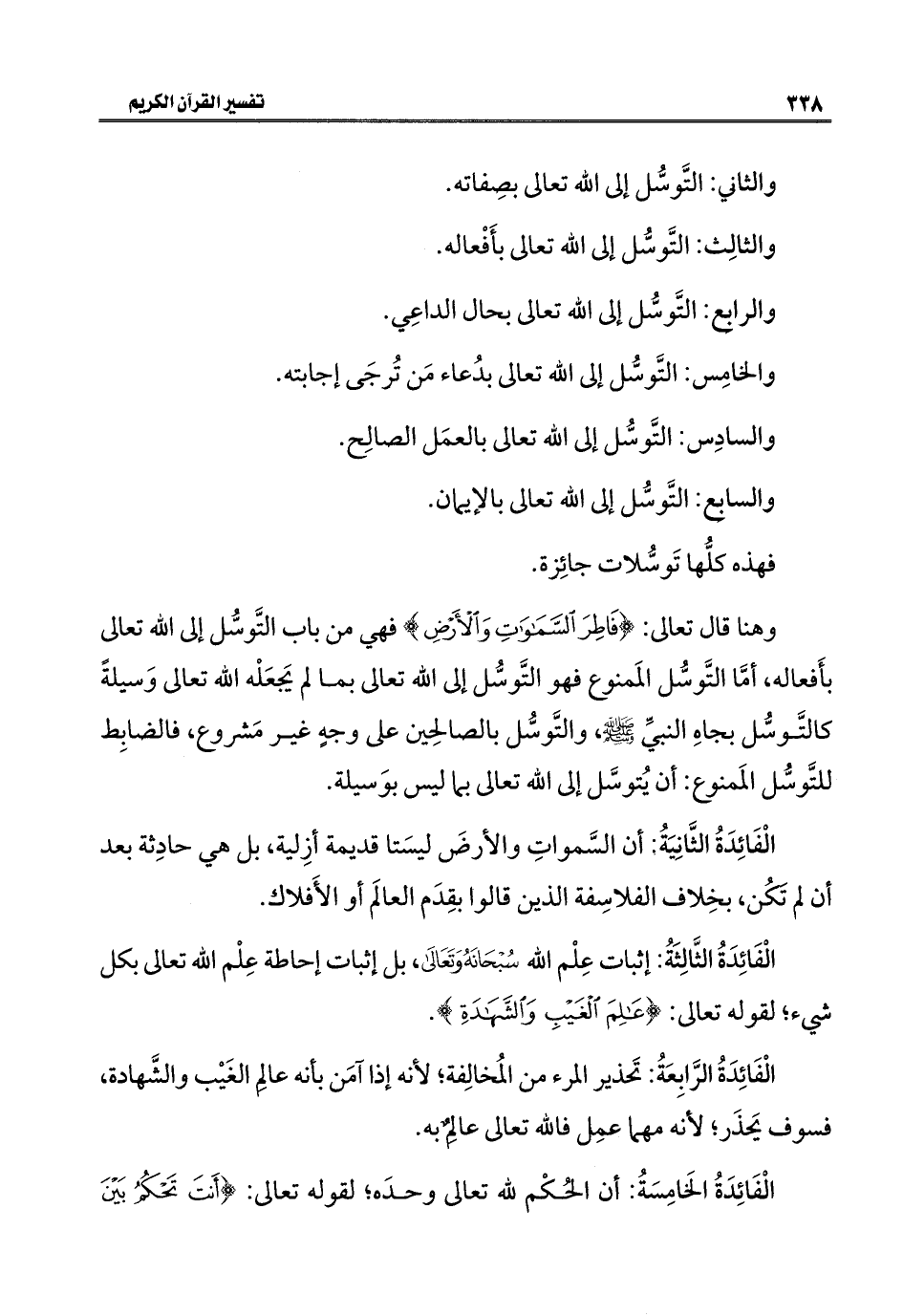 وهنا قال تعالى: {فَاطِرَ السَّمَاوَاتِ وَالْأَرْضِ} فهي من باب التَّوسُّل إلى الله تعالى بأَفعاله، أمَّا التَّوسُّل المَمنوع فهو التَّوسُّل إلى الله تعالى بما لم يَجعَلْه الله تعالى وَسيلةً كالتَّوسُّل بجاهِ النبيِّ - صلى الله عليه وسلم -، والتَّوسُّل بالصالِحين على وجهٍ غير مَشروع، فالضابِط للتَّوسُّل المَمنوع: أن يُتوسَّل إلى الله تعالى بما ليس بوَسيلة.