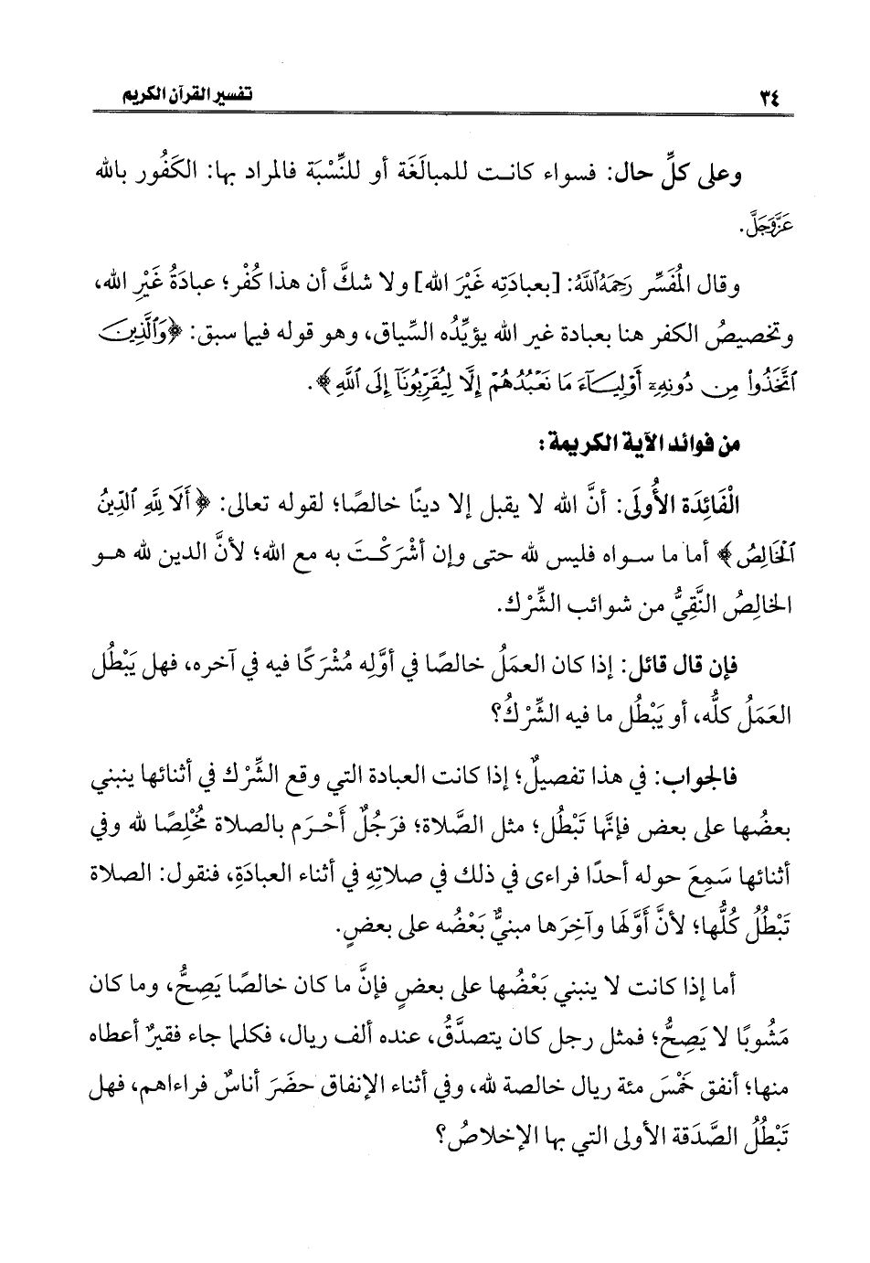 الْفَائِدَة الأُولَى: أنَّ الله لا يقبل إلا دينًا خالصًا؛ لقوله تعالى: {أَلَا لِلَّهِ الدِّينُ الْخَالِصُ} أمأ ما سواه فليس لله حتى وإن أشْرَكْتَ به مع الله؛ لأنَّ الدين لله هو الخالِصُ النَّقِيُّ من شوائب الشِّرْك.