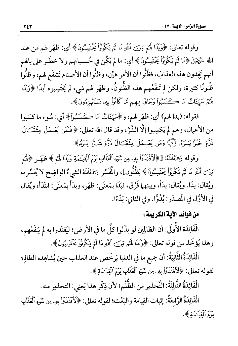 وقوله رَحِمَهُ اللهُ: [{لَافْتَدَوْا بِهِ مِنْ سُوءِ الْعَذَابِ يَوْمَ الْقِيَامَةِ وَبَدَا لَهُمْ} ظهَر {لَهُمْ مِنَ اللَّهِ مَا لَمْ يَكُونُوا يَحْتَسِبُونَ} يَظُنُّون]، والمُفَسِّر رَحِمَهُ اللهُ الشيءُ الواضِح لا يُفسِّره، ويُقال: بدَا. ويُقال: بدَأَ، وبينهما فَرْق، فبَدَا بمَعنَى: ظهَر، وبدَأَ بمَعنَى: ابتَدَأ، ويُقال في الأوَّل في المَصدَر: بُدُوًّا. وفي الثاني: بَدْءًا.
