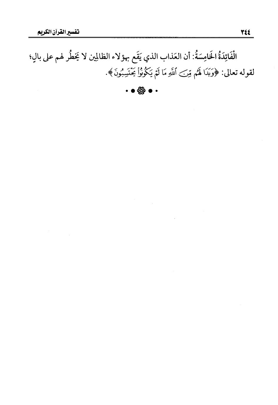 الْفَائِدَةُ الخَامِسَةُ: أن العَذاب الذي يَقَع بهؤلاء الظالمِين لا يَخطُر لهم على بالٍ؛ لقوله تعالى: {وَبَدَا لَهُمْ مِنَ اللَّهِ مَا لَمْ يَكُونُوا يَحْتَسِبُونَ}.