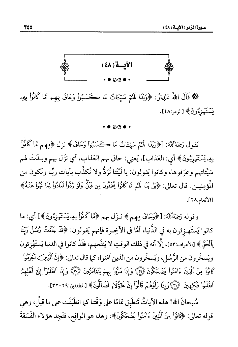 يَقول رَحِمَهُ اللهُ: [{وَبَدَا لَهُمْ سَيِّئَاتُ مَا كَسَبُوا وَحَاقَ} نزل {بِهِمْ مَا كَانُوا بِهِ يَسْتَهْزِئُونَ} أيِ: العَذاب]، يَعنِي: حاق بهم العَذاب، أي نزَل بهم وبدَتْ لهم سَيِّئاتهم وعرَفوها، وكانوا يَقولون: يا لَيْتَنا نُردُّ ولا نُكذِّب بآيات ربِّنا ونَكون من المُؤمِنين. قال تعالى: {بَلْ بَدَا لَهُمْ مَا كَانُوا يُخْفُونَ مِنْ قَبْلُ وَلَوْ رُدُّوا لَعَادُوا لِمَا نُهُوا عَنْهُ} [الأنعام: ٢٨].