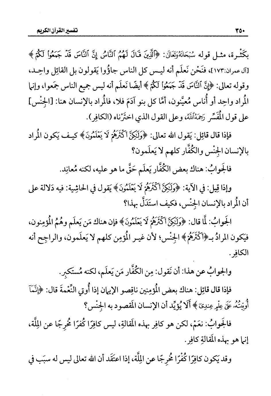 وإذا قِيل: في الآية: {وَلَكِنَّ أَكْثَرَهُمْ لَا يَعْلَمُونَ} يَقول في الحاشِية: فيه دَلالة على أن المُراد بالإنسان الجِنْس، فكيف استَدَلَّ بهذا؟