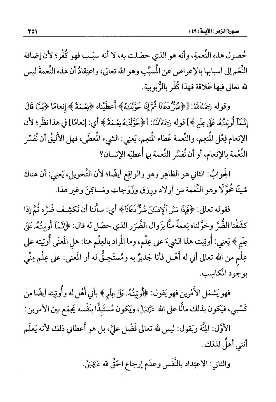 وقوله رَحِمَهُ اللهُ: [{ضُرٌّ دَعَانَا ثُمَّ إِذَا خَوَّلْنَاهُ} أَعطَيْناه {نِعْمَةً} إِنعامًا {مِنَّا قَالَ إِنَّمَا أُوتِيتُهُ عَلَى عِلْمٍ}] قوله رَحِمَهُ اللهُ: {خَوَّلْنَاهُ نِعْمَةً} أي: إنعامًا] في هذا نظَر؛ لأن الإنعام فِعْل المُنعِم، والنِّعمة عَطاء المُنعِم، يَعنِي: الشيء المُعطَى، فهل الأَليقُ أن نُفسِّر النِّعْمة بالإنعام، أو أن نُفسِّر النِّعمة بما أُعطيَه الإنسان؟