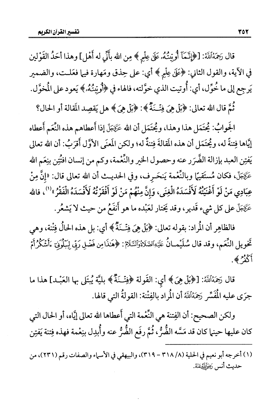قال رَحِمَهُ اللهُ: [{إِنَّمَا أُوتِيتُهُ عَلَى عِلْمٍ} مِن الله بأَنِّي له أَهْل] وهذا أحَدُ القَوْلين في الآية، والقول الثاني: {عَلَى عِلْمٍ} أي: على حِذق ومَهارة فيما فعَلت، والضمير يَرجِع إلى ما خُوِّل، أي: أُوتيت الذي خوَّلته، فالهاء في {أُوتِيتُهُ} يَعود على المُخوَّل.