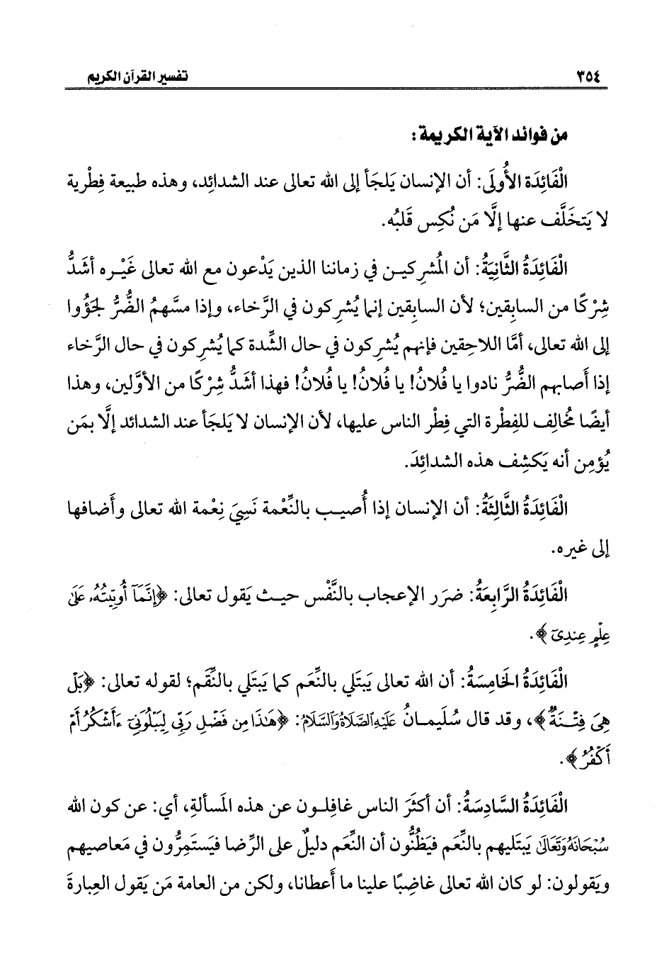 الْفَائِدَةُ الرَّابِعَةُ: ضرَر الإعجاب بالنَّفْس حيث يَقول تعالى: {إِنَّمَا أُوتِيتُهُ عَلَى عِلْمٍ عِنْدِي}.