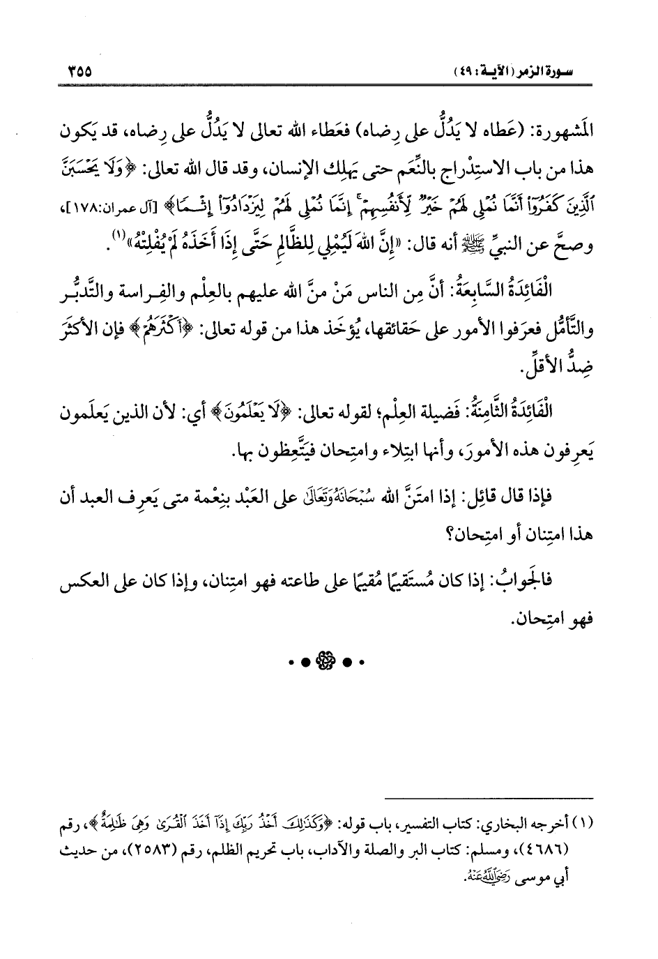 المَشهورة: (عَطاه لا يَدُلُّ على رِضاه) فعَطاء الله تعالى لا يَدُلُّ على رِضاه، قد يَكون هذا من باب الاستِدْراج بالنِّعَم حتى يَهلِك الإنسان، وقد قال الله تعالى: {وَلَا يَحْسَبَنَّ الَّذِينَ كَفَرُوا أَنَّمَا نُمْلِي لَهُمْ خَيْرٌ لِأَنْفُسِهِمْ إِنَّمَا نُمْلِي لَهُمْ لِيَزْدَادُوا إِثْمًا} [آل عمران: ١٧٨]، وصحَّ عن النبيِّ - صلى الله عليه وسلم - أنه قال: "إِنَّ الله لَيُمْلِي لِلظَّالِمِ حَتَّى إِذَا أَخَذَهُ لَمْ يُفْلِتْهُ" (١).