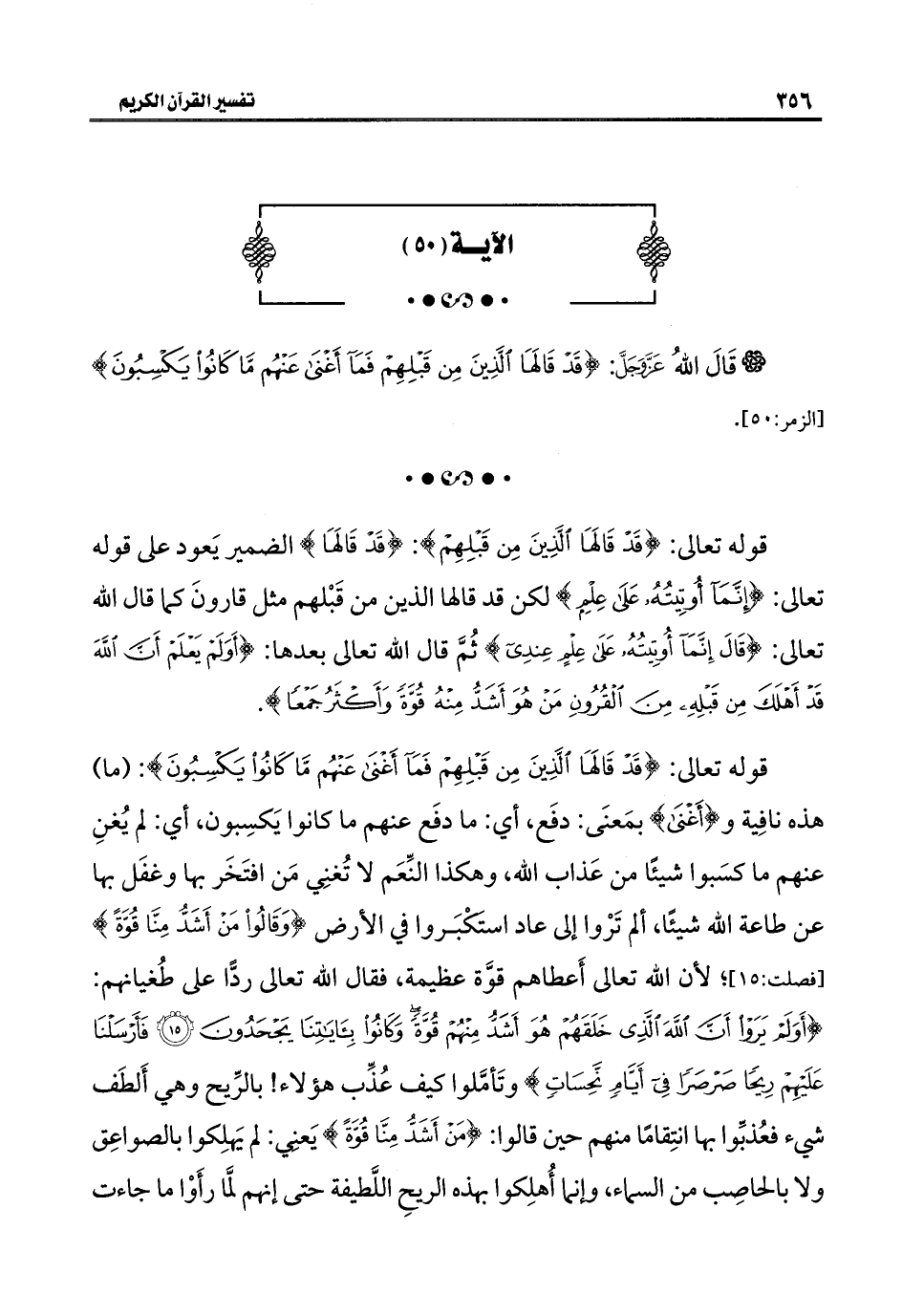 قوله تعالى: {قَدْ قَالَهَا الَّذِينَ مِنْ قَبْلِهِمْ فَمَا أَغْنَى عَنْهُمْ مَا كَانُوا يَكْسِبُونَ}: (ما) هذه نافِية و {أَغْنَى} بمَعنَى: دفَع، أي: ما دفَع عنهم ما كانوا يَكسِبون، أي: لم يُغنِ عنهم ما كسَبوا شيئًا من عَذاب الله، وهكذا النِّعَم لا تُغنِي مَن افتَخَر بها وغفَل بها عن طاعة الله شيئًا، ألم تَرْوا إلى عاد استَكْبَروا في الأرض {وَقَالُوا مَنْ أَشَدُّ مِنَّا قُوَّةً} [فصلت: ١٥]؛ لأن الله تعالى أَعطاهم قوَّة عظيمة، فقال الله تعالى ردًّا على طُغيانهم: {أَوَلَمْ يَرَوْا أَنَّ اللَّهَ الَّذِي خَلَقَهُمْ هُوَ أَشَدُّ مِنْهُمْ قُوَّةً وَكَانُوا بِآيَاتِنَا يَجْحَدُونَ (١٥) فَأَرْسَلْنَا عَلَيْهِمْ رِيحًا صَرْصَرًا فِي أَيَّامٍ نَحِسَاتٍ} وتَأمَّلوا كيف عُذِّب هؤلاء! بالرِّيح وهي أَلطَف شيء فعُذبِّوا بها انتِقامًا منهم حين قالوا: {مَنْ أَشَدُّ مِنَّا قُوَّةً} يَعنِي: لم يَهلِكوا بالصواعِق ولا بالحاصِب من السماء، وإنما أُهلِكوا بهذه الريحِ اللَّطيفة حتى إنهم لمَّا رأَوْا ما جاءت