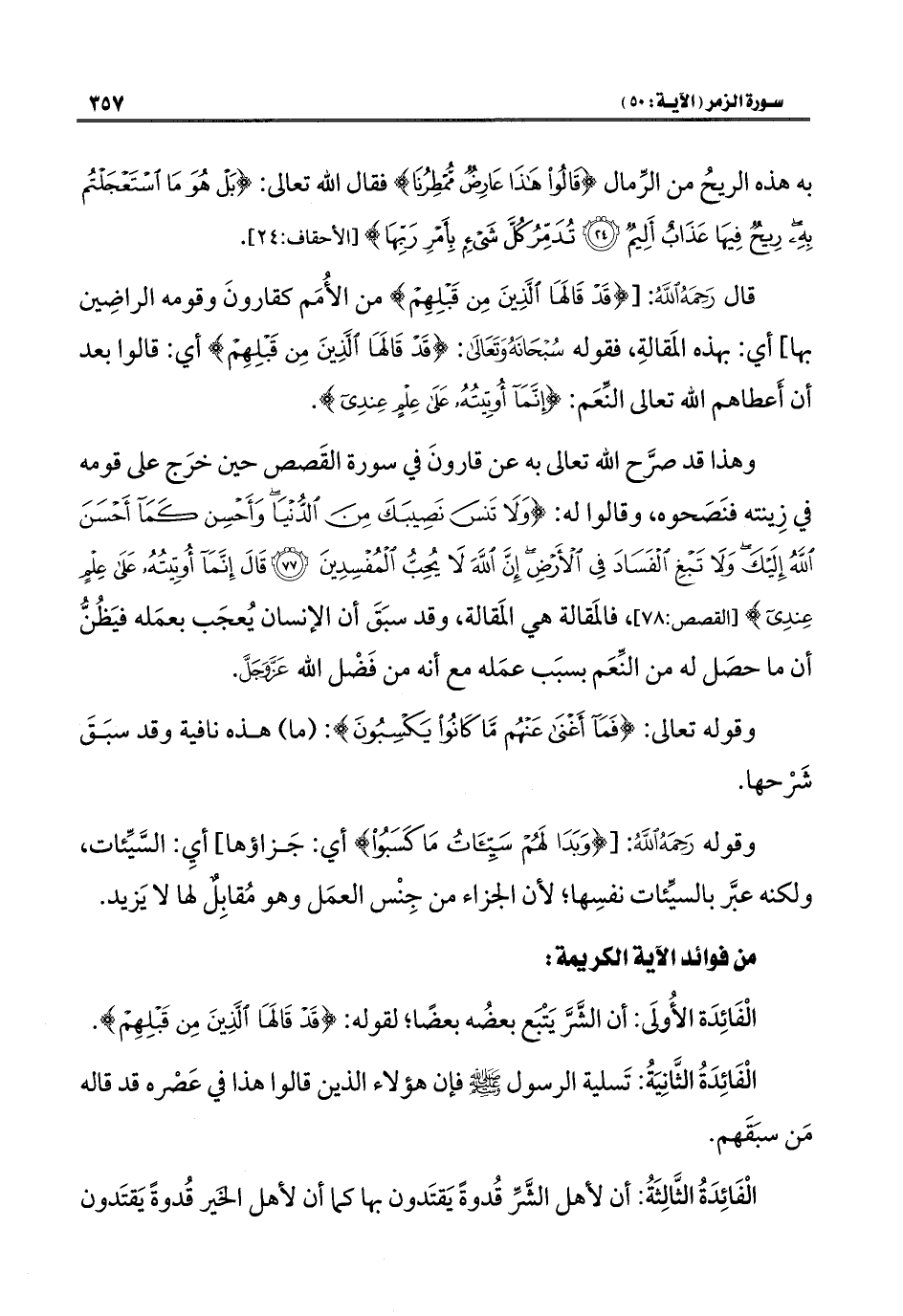 قال رَحِمَهُ اللهُ: [{قَدْ قَالَهَا الَّذِينَ مِنْ قَبْلِهِمْ} من الأُمَم كقارونَ وقومه الراضِين بها] أي: بهذه المَقالةِ، فقوله سُبْحَانَهُ وَتَعَالَى: {قَدْ قَالَهَا الَّذِينَ مِنْ قَبْلِهِمْ} أي: قالوا بعد أن أَعطاهم الله تعالى النِّعَم: {إِنَّمَا أُوتِيتُهُ عَلَى عِلْمٍ عِنْدِي}.