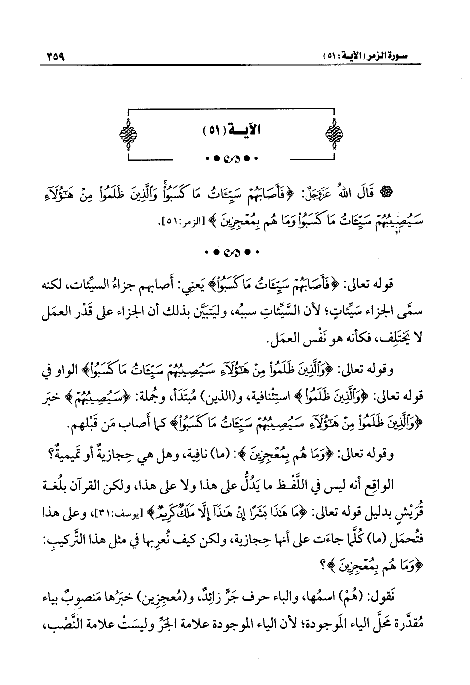 * قَالَ اللهُ عَزَّ وَجَلَّ: {فَأَصَابَهُمْ سَيِّئَاتُ مَا كَسَبُوا وَالَّذِينَ ظَلَمُوا مِنْ هَؤُلَاءِ سَيُصِيبُهُمْ سَيِّئَاتُ مَا كَسَبُوا وَمَا هُمْ بِمُعْجِزِينَ} [الزمر: ٥١].