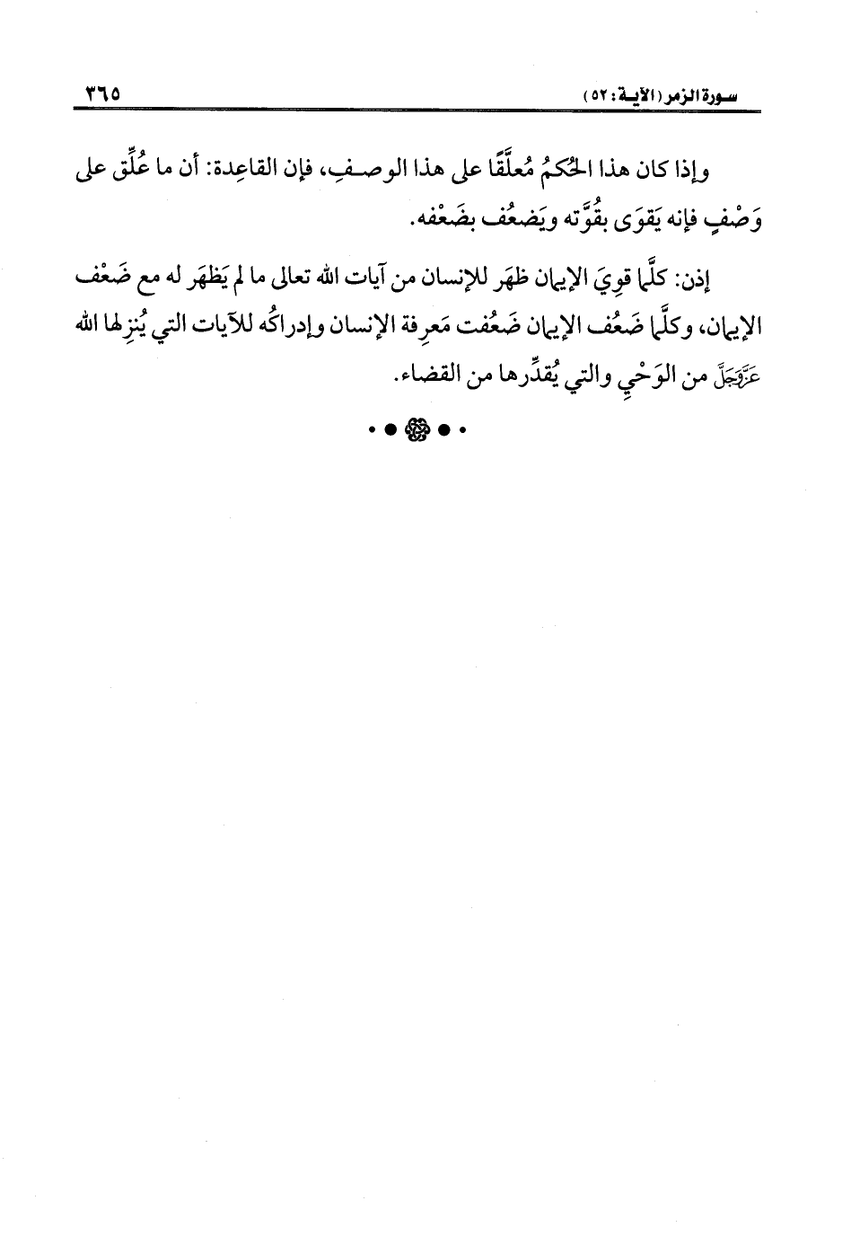 إذن: كلَّما قوِيَ الإيمان ظهَر للإنسان من آيات الله تعالى ما لم يَظهَر له مع ضَعْف الإيمان, وكلَّما ضَعُف الإيمان ضَعُفت مَعرِفة الإنسان وإدراكُه للآيات التي يُنزِلها الله عَزَّ وَجَلَّ من الوَحْيِ والتي يُقدِّرها من القضاء.