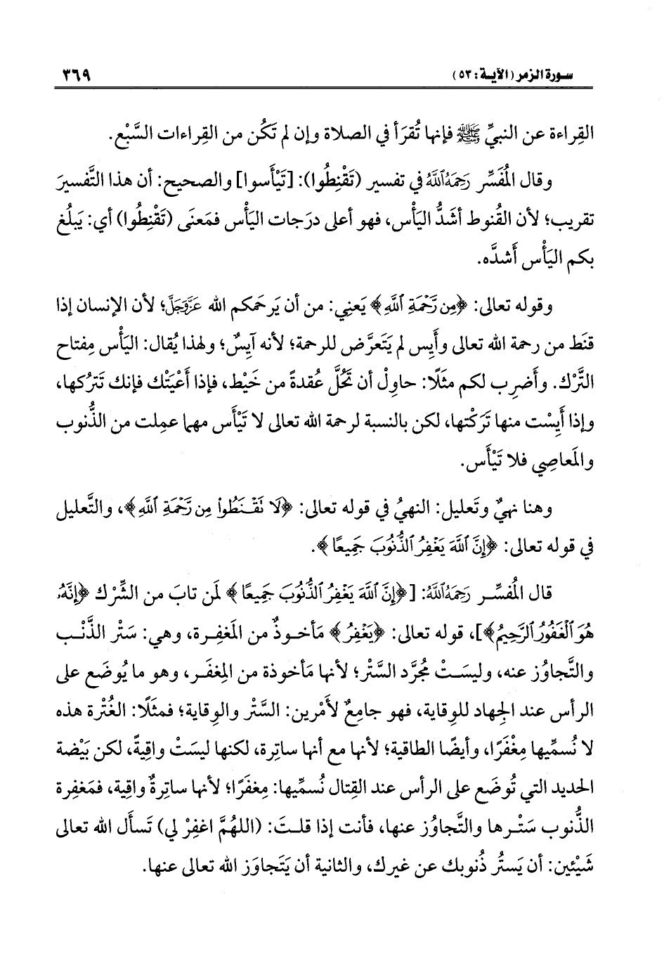 وقال المُفَسِّر رَحِمَهُ اللهُ في تفسير (تَقْنِطُوا): [تَيْأَسوا] والصحيح: أن هذا التَّفسيرَ تقريب؛ لأن القُنوط أشَدُّ اليَأْس، فهو أعلى درَجات اليَأْس فمَعنَى (تَقْنِطُوا) أي: يَبلُغ بكم اليَأْس أَشدَّه.