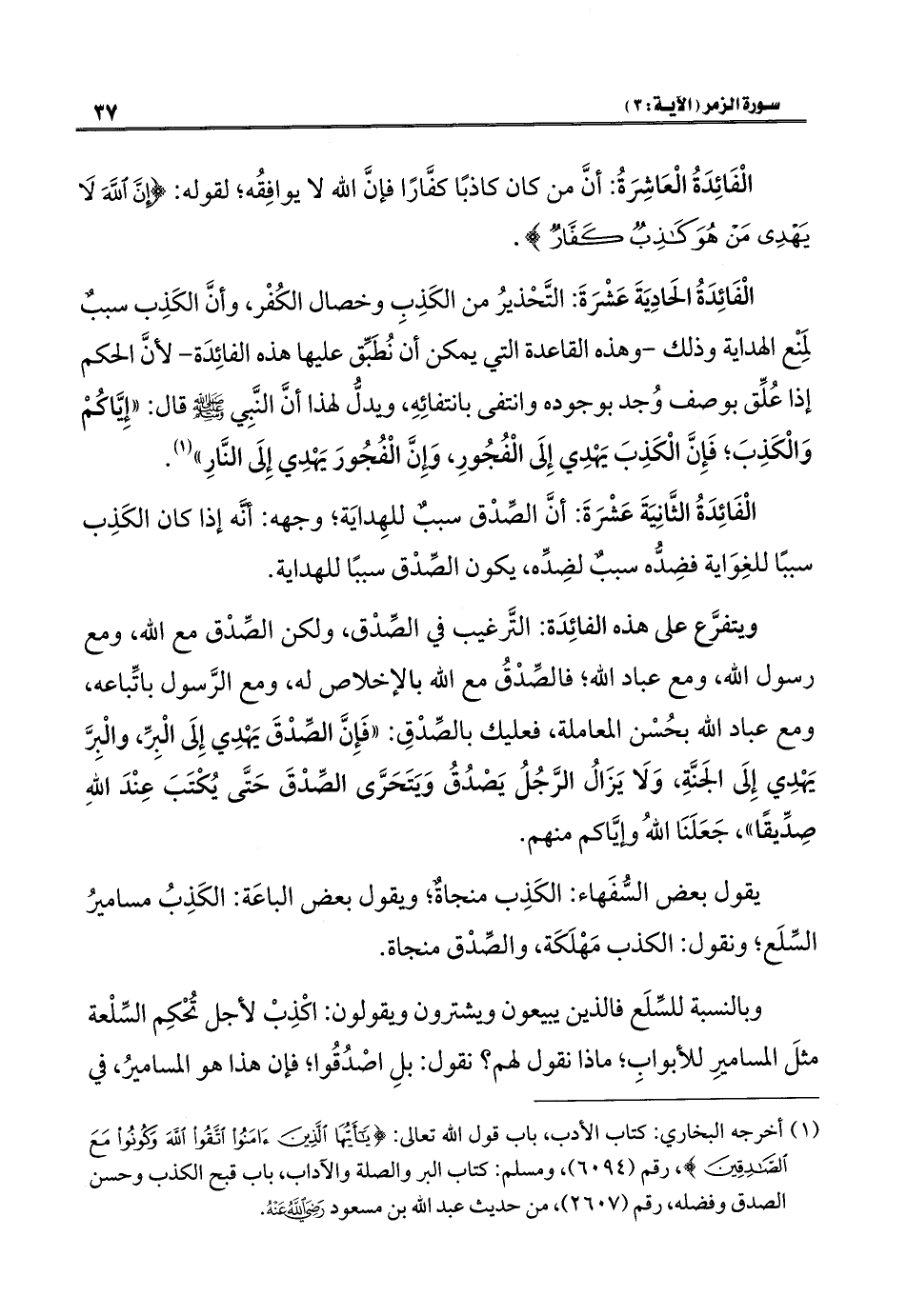 الْفَائِدَةُ الثَّانِيَةَ عَشْرَةَ: أنَّ الصِّدْق سببٌ للهِدايَة؛ وجهه: أنَّه إذا كان الكَذِب سببًا للغِوَاية فضِدُّه سببٌ لضِدِّه، يكون الصِّدْق سببًا للهداية.