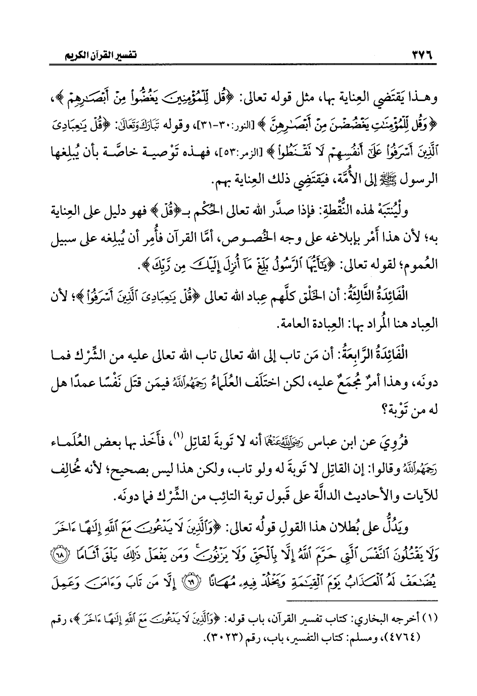 وهذا يَقتَضي العِناية بها، مثل قوله تعالى: {قُلْ لِلْمُؤْمِنِينَ يَغُضُّوا مِنْ أَبْصَارِهِمْ} , {وَقُلْ لِلْمُؤْمِنَاتِ يَغْضُضْنَ مِنْ أَبْصَارِهِنَّ} [النور: ٣٠ - ٣١]، وقوله تَبَارَكَ وَتَعَالَى: {قُلْ يَاعِبَادِيَ الَّذِينَ أَسْرَفُوا عَلَى أَنْفُسِهِمْ لَا تَقْنَطُوا} [الزمر: ٥٣]، فهذه تَوْصية خاصَّة بأن يُبلِغها الرسول - صلى الله عليه وسلم - إلى الأُمَّة، فيَقتَضِي ذلك العِناية بهم.