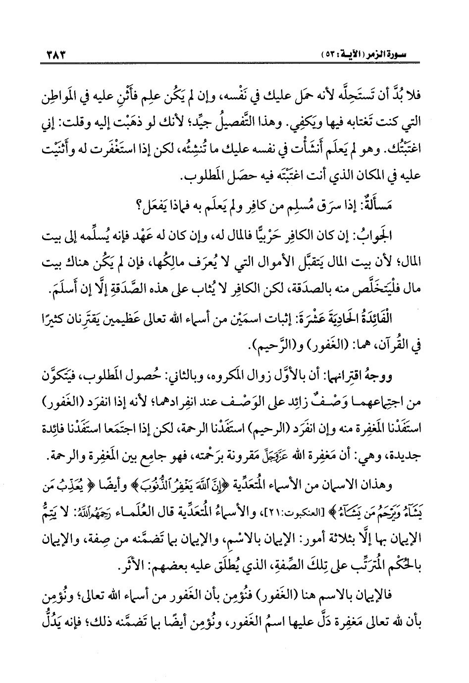 وهذان الاسمان من الأسماء المُتعَدِّية {إِنَّ اللَّهَ يَغْفِرُ الذُّنُوبَ} وأيضًا {يُعَذِّبُ مَنْ يَشَاءُ وَيَرْحَمُ مَنْ يَشَاءُ} [العنكبوت: ٢١]، والأسماءُ المُتعَدِّية قال العُلَماء رَحِمَهُم اللهُ: لا يَتِمُّ الإيمان بها إلَّا بثلاثة أمور: الإيمان بالاسْمِ، والإيمان بما تَضمَّنه من صِفة، والإيمان بالحُكْم المُترَتِّب على تِلكَ الصِّفةِ، الذي يُطلَق عليه بعضهم: الأثَر.