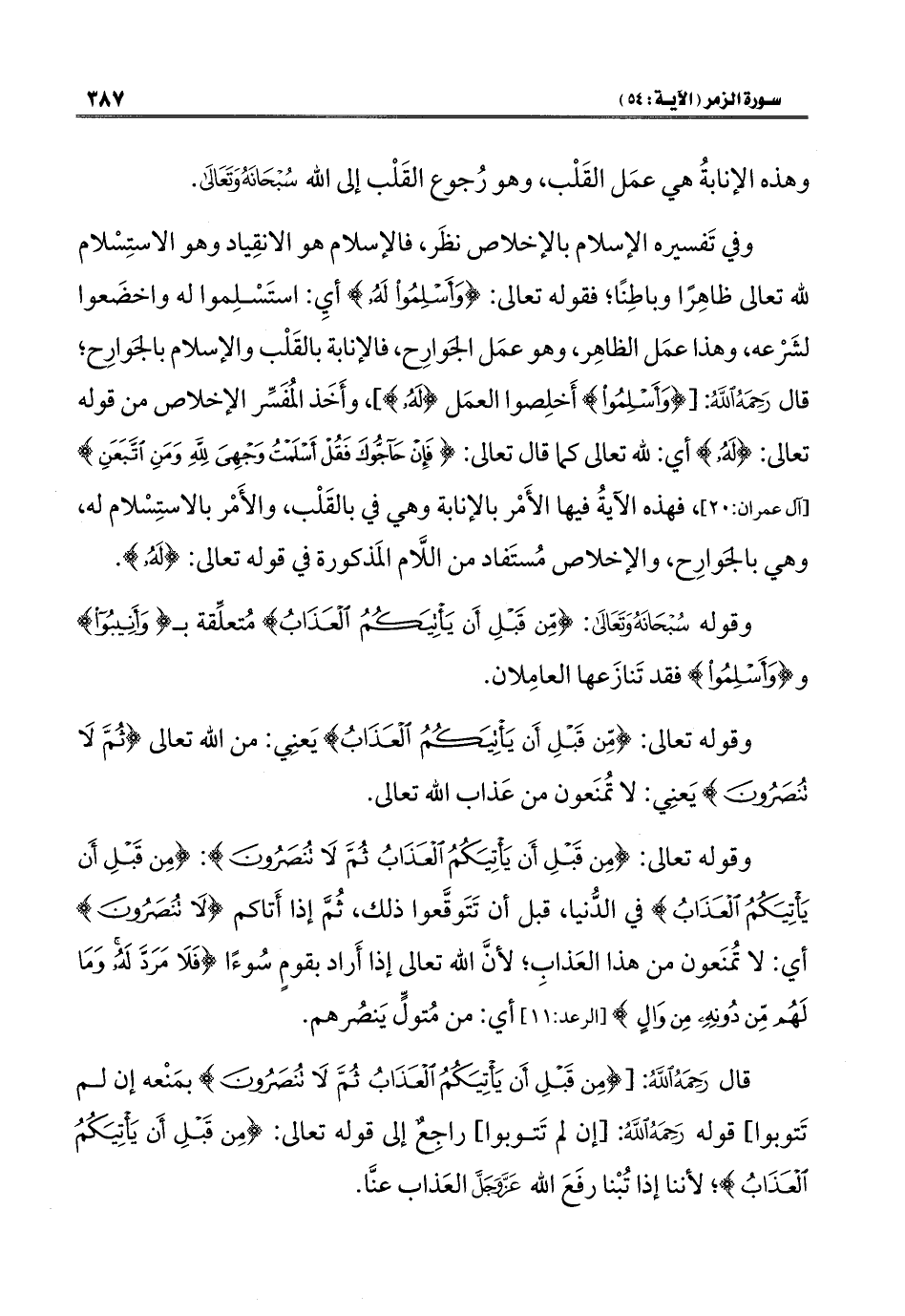 وفي تَفسيره الإِسلام بالإخلاص نظَر، فالإِسلام هو الانقِياد وهو الاستِسْلام لله تعالى ظاهِرًا وباطِنًا؛ فقوله تعالى: {وَأَسْلِمُوا لَهُ} أيِ: استَسْلِموا له واخضَعوا لشَرْعه، وهذا عمَل الظاهِر، وهو عمَل الجَوارِح، فالإنابة بالقَلْب والإِسلام بالجَوارِح؛ قال رَحِمَهُ اللهُ: [{وَأَسْلِمُوا لَهُ} أَخلِصوا العمَل {لَهُ}]، وأَخَذ المُفَسِّر الإخلاص من قوله تعالى: {لَهُ} أي: لله تعالى كما قال تعالى: {فَإِنْ حَاجُّوكَ فَقُلْ أَسْلَمْتُ وَجْهِيَ لِلَّهِ وَمَنِ اتَّبَعَنِ} [آل عمران: ٢٠]، فهذه الآيةُ فيها الأَمْر بالإنابة وهي في بالقَلْب، والأَمْر بالاستِسْلام له، وهي بالجَوارِح، والإخلاص مُستَفاد من اللَّام المَذكورة في قوله تعالى: {لَهُ}.