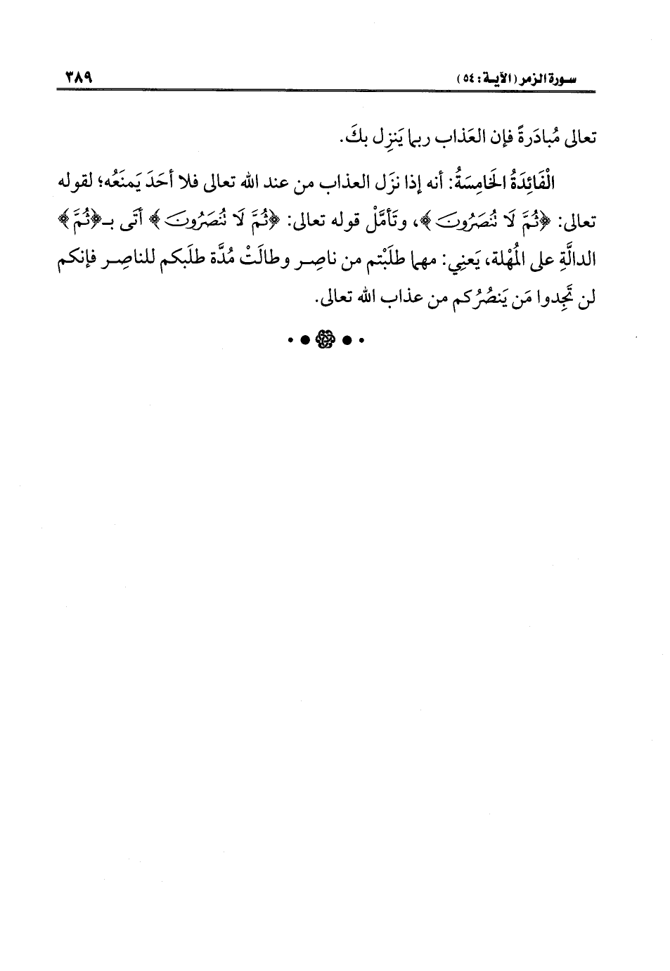 الْفَائِدَةُ الخَامِسَةُ: أنه إذا نزَل العذاب من عند الله تعالى فلا أحَدَ يَمنَعُه؛ لقوله تعالى: {ثُمَّ لَا تُنْصَرُونَ}، وتَأمَّلْ قوله تعالى: {ثُمَّ لَا تُنْصَرُونَ} أتَى بـ {ثُمَّ} الدالَّةِ على المُهْلة، يَعنِي: مهما طلَبْتم من ناصِر وطالَتْ مُدَّة طلَبكم للناصِر فإنكم لن تَجِدوا مَن يَنصُرُكم من عذاب الله تعالى.